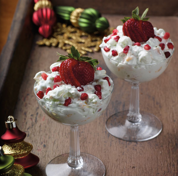 I first tasted this versatile “salad” in 1979 at a cookie exchange/brunch one of my neighbors in Lake Ridge, Virginia, hosted. Fortunately, she always sent us home with a book of recipes. That Christmas I tested the recipe out on my family, and they loved it. Since then, it’s been a go-to dish for the holidays. It’s also perfect for office parties, potlucks and bridal/baby showers. It’s simple to make. Feel free to improvise. Add fresh fruit or fruit you preserved/froze. Apples, bananas and nuts are great additions, too. Lately, I’m into using pomegranate and fresh berries to garnish the salad. I like to serve it in “memorable” pieces such as the Champagne glasses (seen here) my parents received as a wedding gift in the 40s. I’ve also served it in my grandmother’s Haviland China tea cups, the Waterford wine glasses I received over the course of several Christmases from my sister, and whatever else I may find.