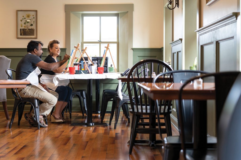 Working with Calabrese Good Architects, the couple expanded the original building with an addition that utilized the footprint of the barn. The addition houses a first-floor kitchen, while the second floor holds meeting space that’s known as The Upper Room (capacity is about 40). The summer kitchen provides a place for small groups (under a dozen) to meet. A brick terrace was also added; it connects the parking lot to the café and The Livery, an event venue that is designed to look like a stable and provides space for up to 70 guests.