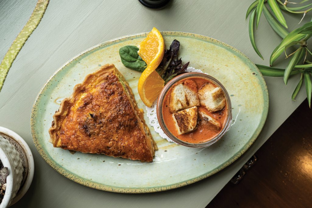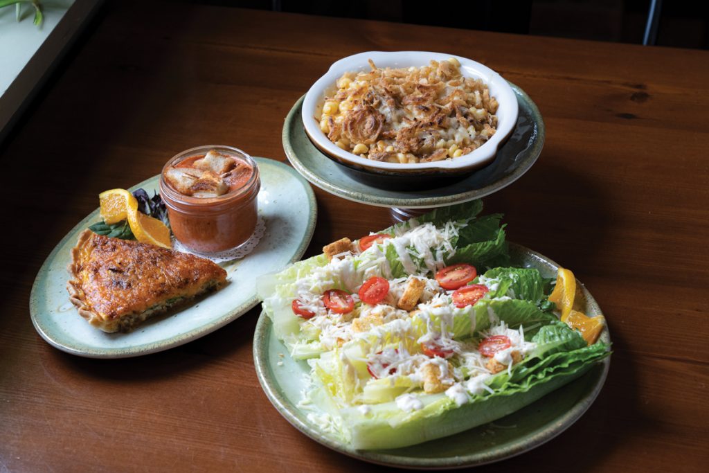Clockwise from top: Lampeter Café’s Signature Mac & Cheese, Caesar Wedge Salad, and a combo of Tomato Soup (with grilled-cheese croûtons) and quiche. Many of the menu items are compatible with gluten-free or vegetarian lifestyles.