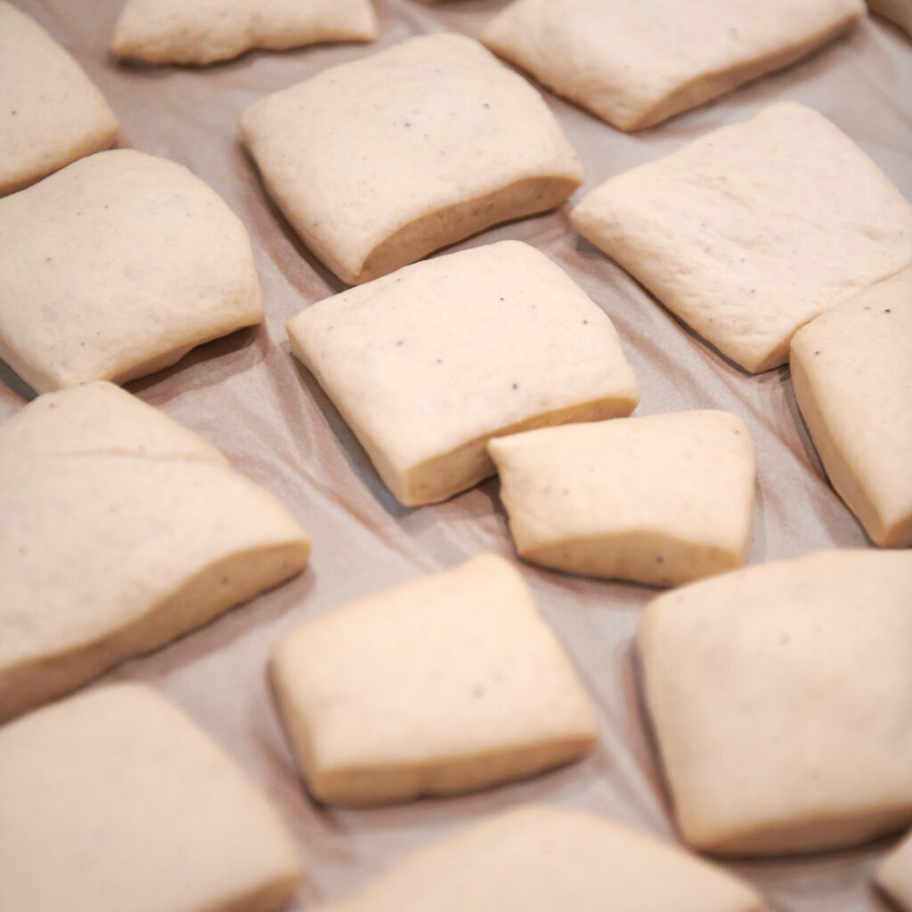 The process of making beignets begins with leavened dough that is cut into squares and then is proofed on baking sheets.