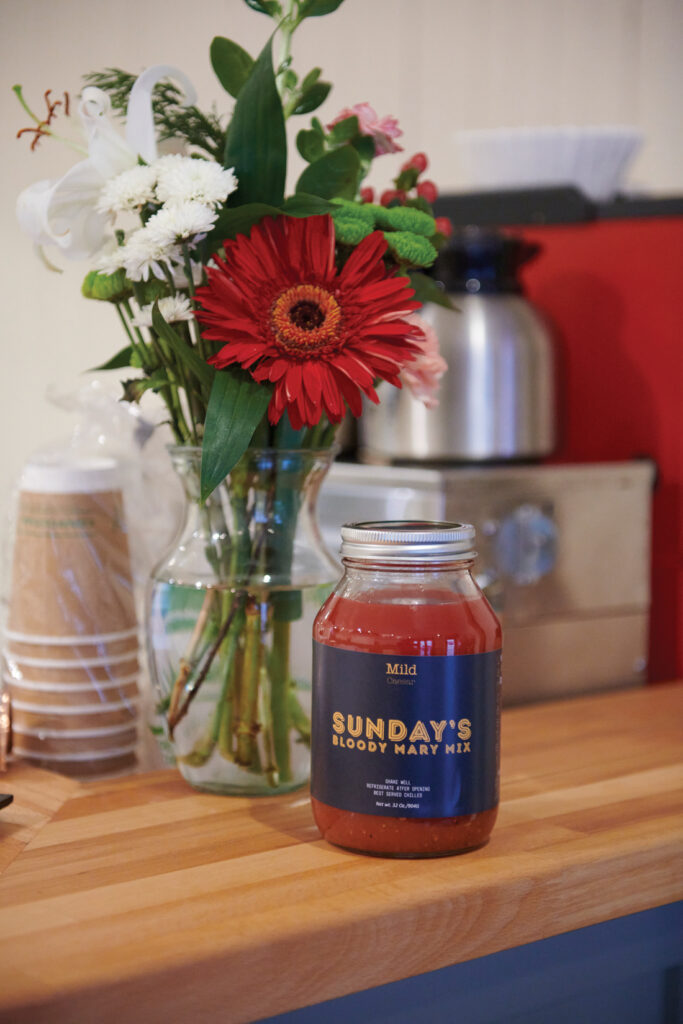 Sunday’s Bloody Mary Mix, which was created by Annie and Collin, is available for purchase at the café. It has also gained a fan base of local restaurant owners who purchase it for use in their bars.