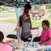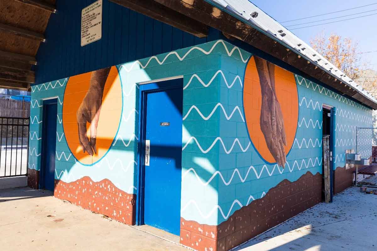 The new mural, entitled Be Like Water, rendered on the exterior walls of the park’s pavilion, draws inspiration from many sources – most of all the park’s neighbors. Even through the constant challenges of a pandemic, artist Salina Almanzar was able to find ways to stay true to her community-based approach to public art (read our article on her previous work here). The mural includes renderings of the hands of Sandy Drakeford and Marie King-Linares, community elders, as they reach down to plant seeds. Neighbors were also invited to contribute their drawings of local flowers and plants, which Almanzar is in the process of incorporating into the mural as a finishing touch.