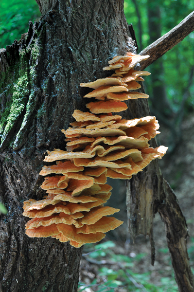 “These bright-orange mushrooms grow on the sides of trees, and nothing looks like them,” says Kevin. Laetiporus is a great mushroom for beginning foragers, writes Ellen Zachos in her book, Backyard Foraging.