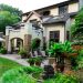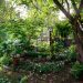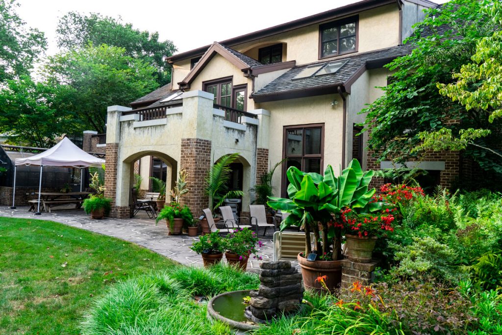 A pond filled with koi fish and water plants provides entrance to the backyard’s gardens.
