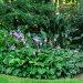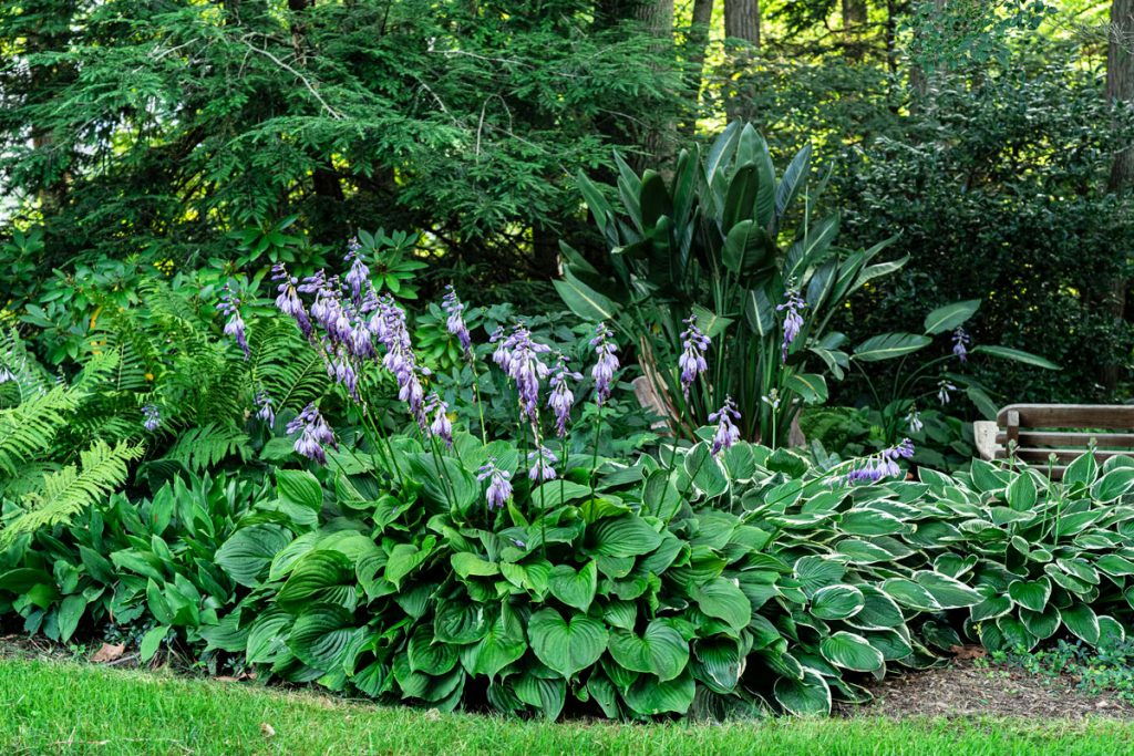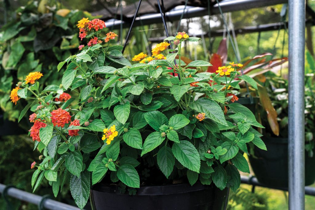 summer garden blooms with daylilies, hosta, begonias, lantana and other flowering plants. Ferns and tropical plants such as palms, which overwinter in the greenhouses, add to the displays.