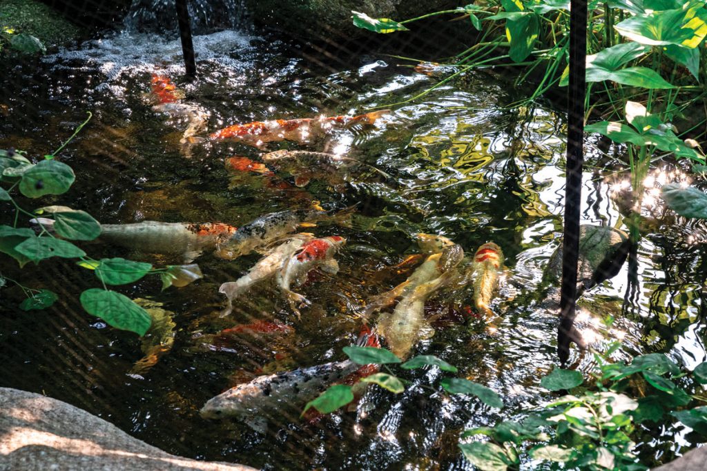 Orchids also prompted an interest in other tropical plants that are used to enhance the landscape and patio during the warm-weather months. The greenhouses provide storage for them over the winter. In keeping with the tropical theme, a large koi pond is on the premises.