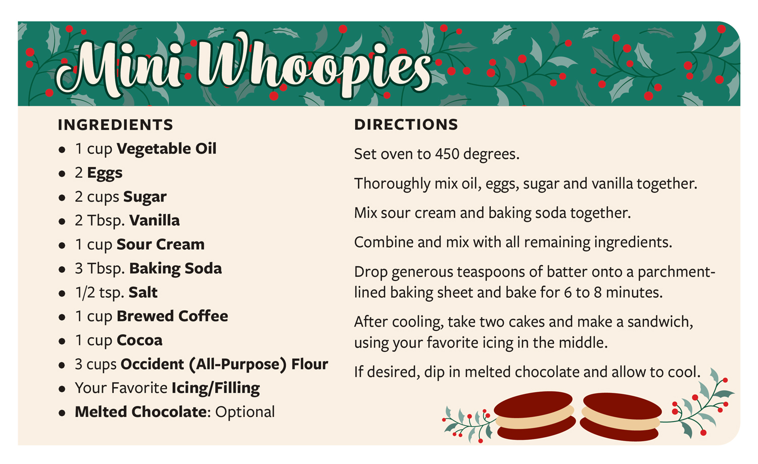 Mini-Whoopies dipped in chocolate were baked by the Fisher family. The second stop took us to the Esh home, where sugar cookies and ornament treats were on the menu. The third stop – the home of a different Esh family – featured pecan cups, Santa confections and hot chocolate. Recipe cards for each cookie recipe (and others) were provided to visitors.