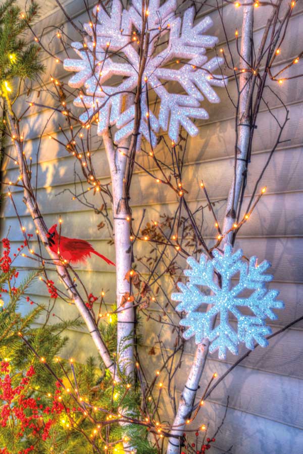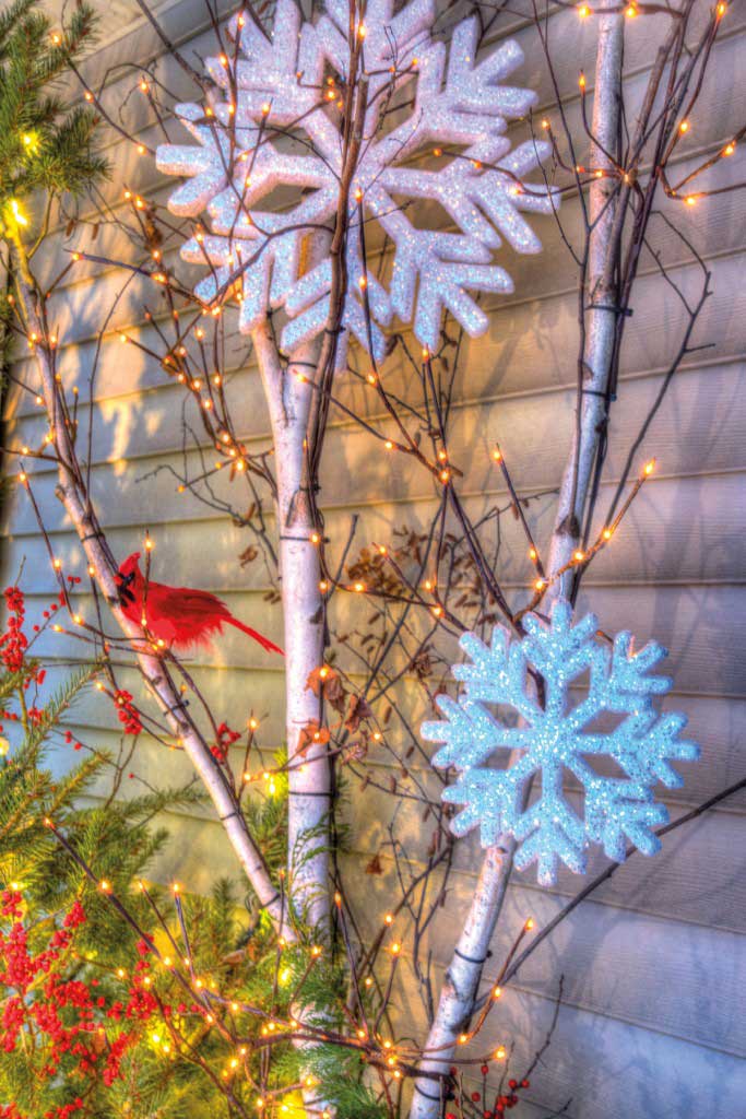 last year, as the holidays approached, Tim discussed his winter-décor idea that centered on snowmen with Colleen. Luckily, she shared that she loves snowmen. So, Tim went to work, creating two larger-than-life snowmen out of oak and birch branches, which were then painted and glittered. Their hats and scarves were fashioned from chicken wire that was then densely covered in black and red glitter. Lights were woven in and around the finished snowmen.