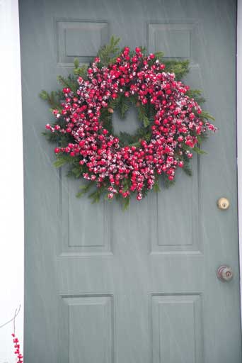 The smaller containers were filled with branches of blue spruce, gold cypress and winterberry. “Anything I can grow and use, I do,” Tim says of the plants and trees that grow on his property. Among them are 75 winterberry bushes that, according to Tim, are yielding a “gorgeous crop for 2014.” The larger containers that sat along the side and at the rear of the house were filled with branches of white birch, white pine, Serbian spruce, Douglas fir, cypress and winterberry. “The nice thing about this design is that it’s just not for Christmas,” Tim explains. “It has a winter theme that could remain in place through February.”