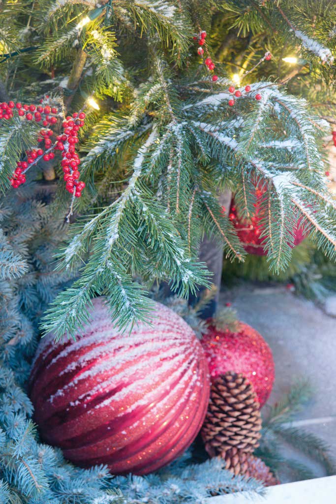 The tallest of the snowmen was positioned on the porch, where it sat amidst Douglas fir trees and branches of white birch that were set into containers. The resulting backdrop was embellished with white LED lights, oversized snowflakes, winterberry branches and cardinals. The floor of the porch glistened with super-sized tree ornaments and natural pinecones. The smaller snowman sat atop the pillar where the pumpkin had stood. Both were surrounded by wreaths of black-drago