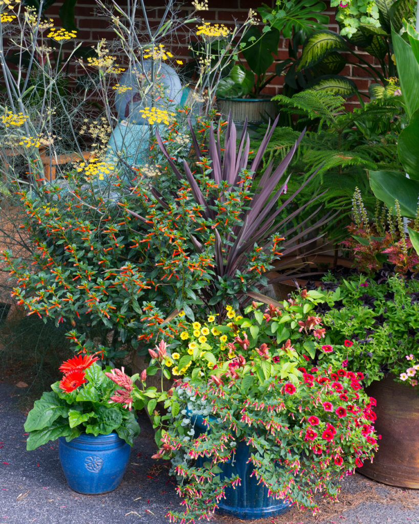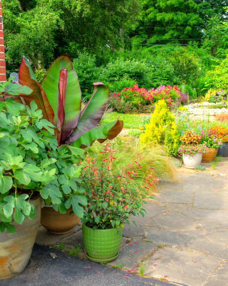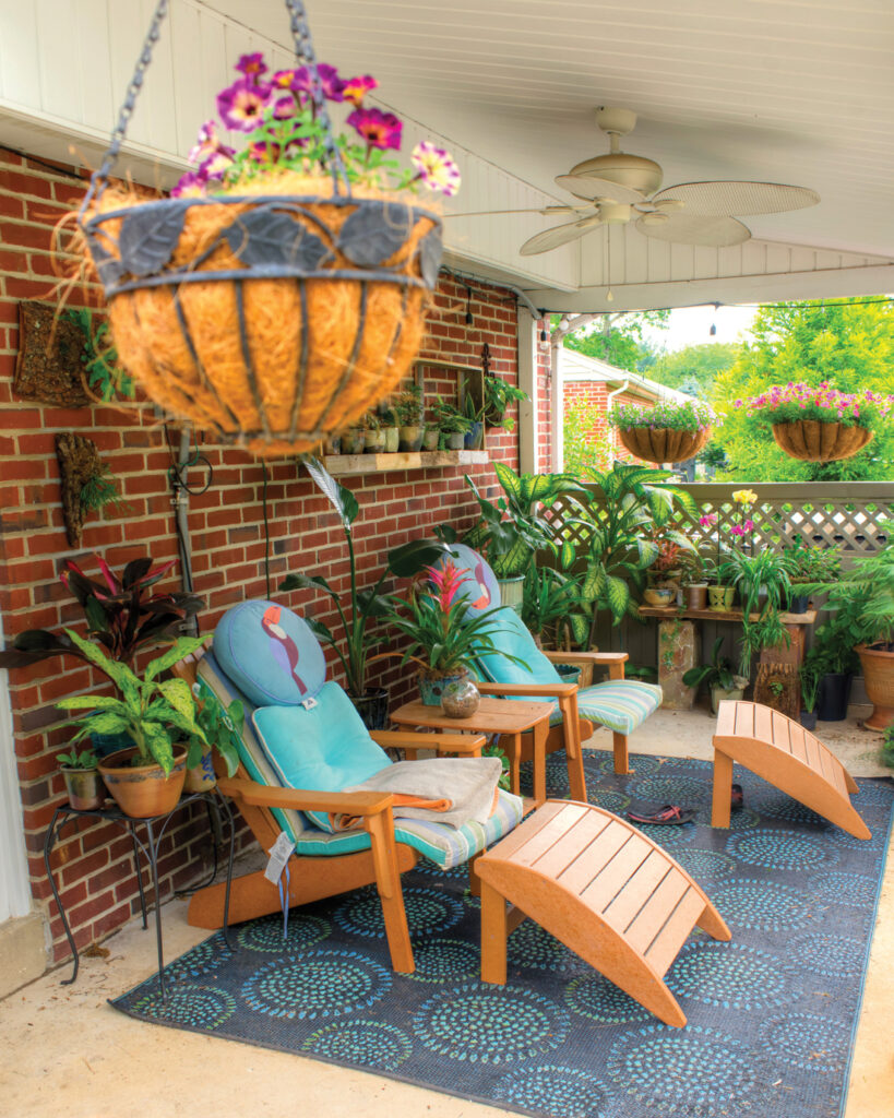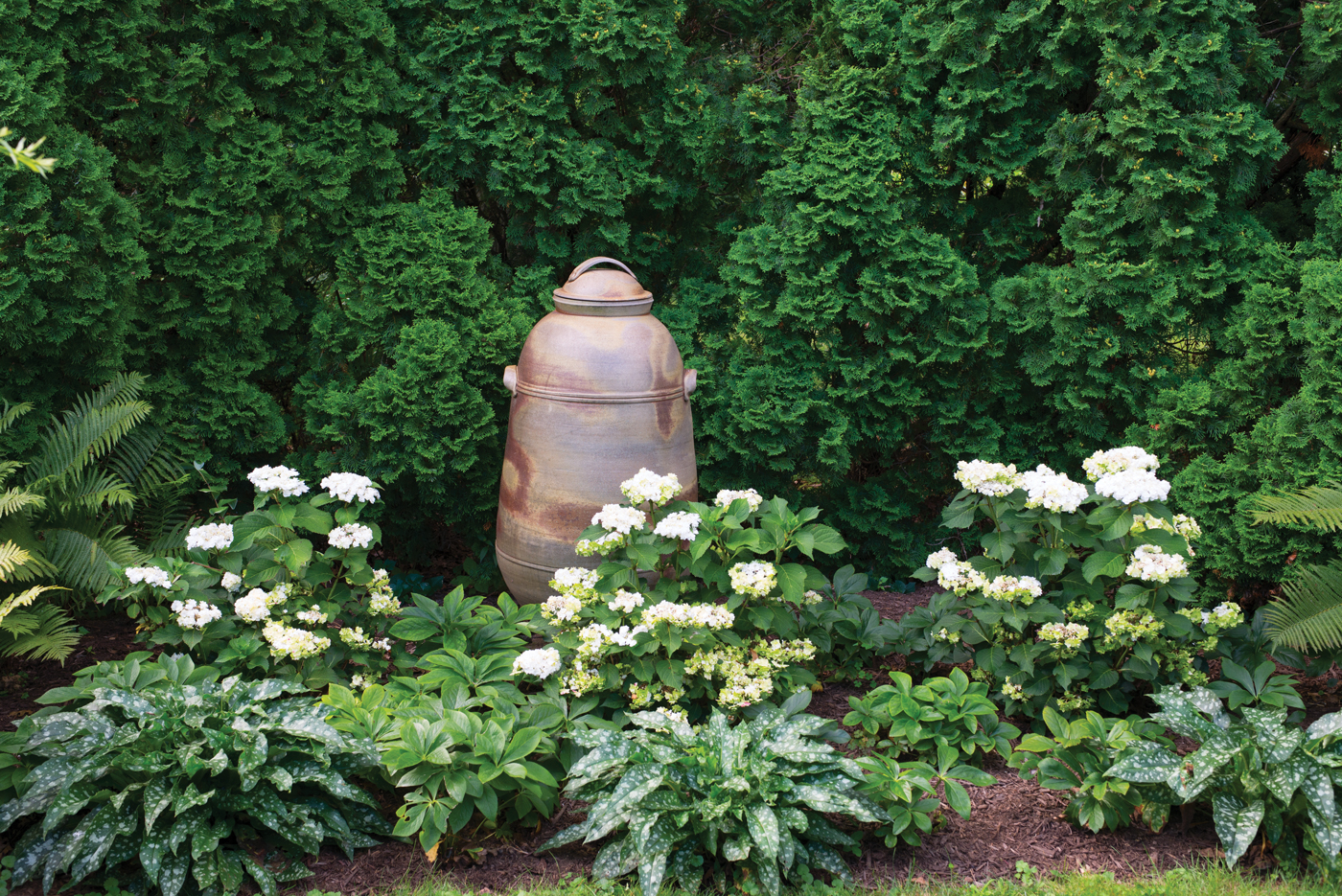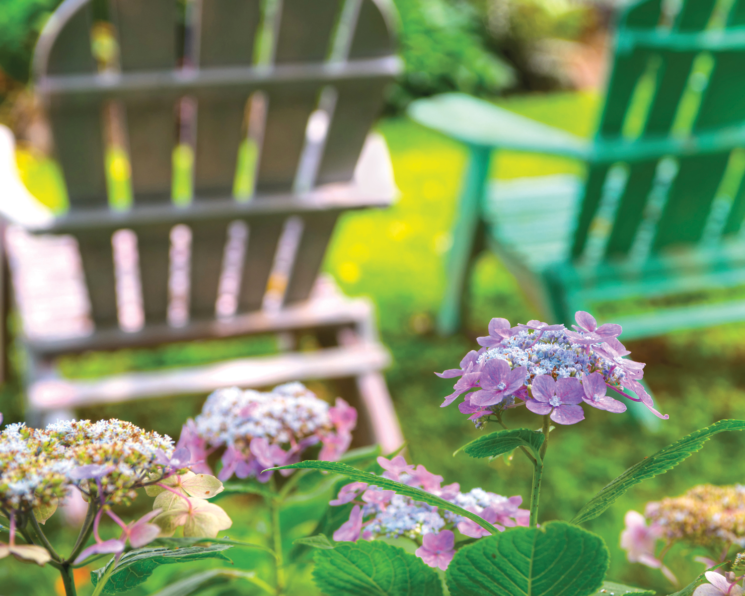 As for the floral display, Stacy employs a combination of annuals and perennials to ensure colorful blooms from spring through late fall. “I’ve gravitated to a palette of opposite colors,” she says. The landscape is also filled with several varieties of hydrangea, as well as native shrubs. Containers are filled with a combination of annuals, perennials and tropicals. While she mulches every year, Stacy does not treat the lawn. “It doesn’t have to look perfect,” she says.