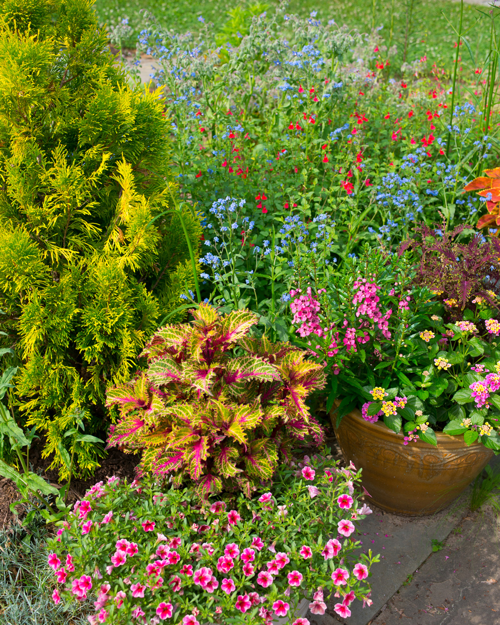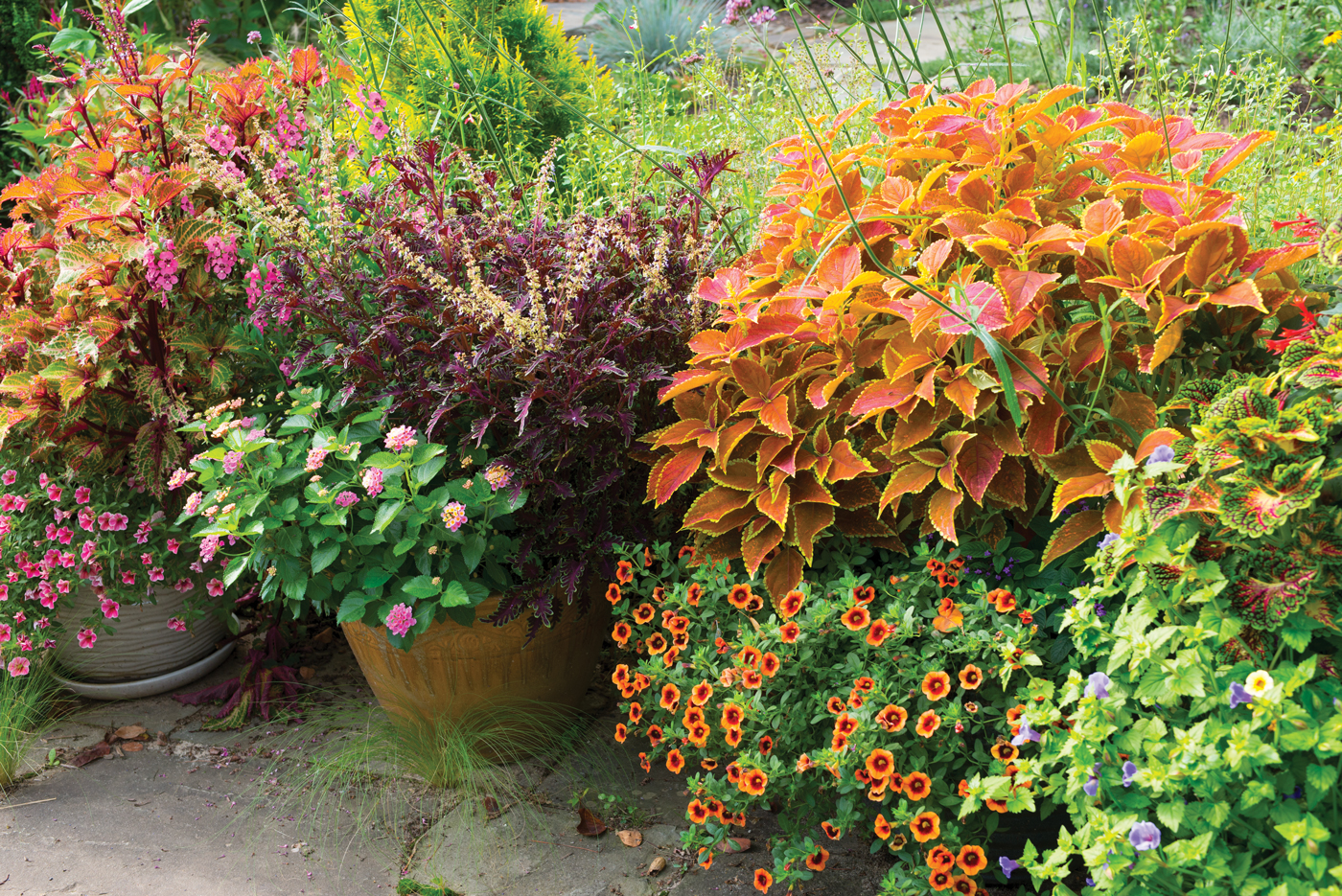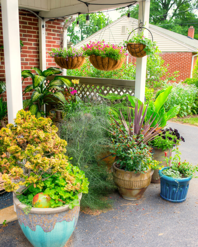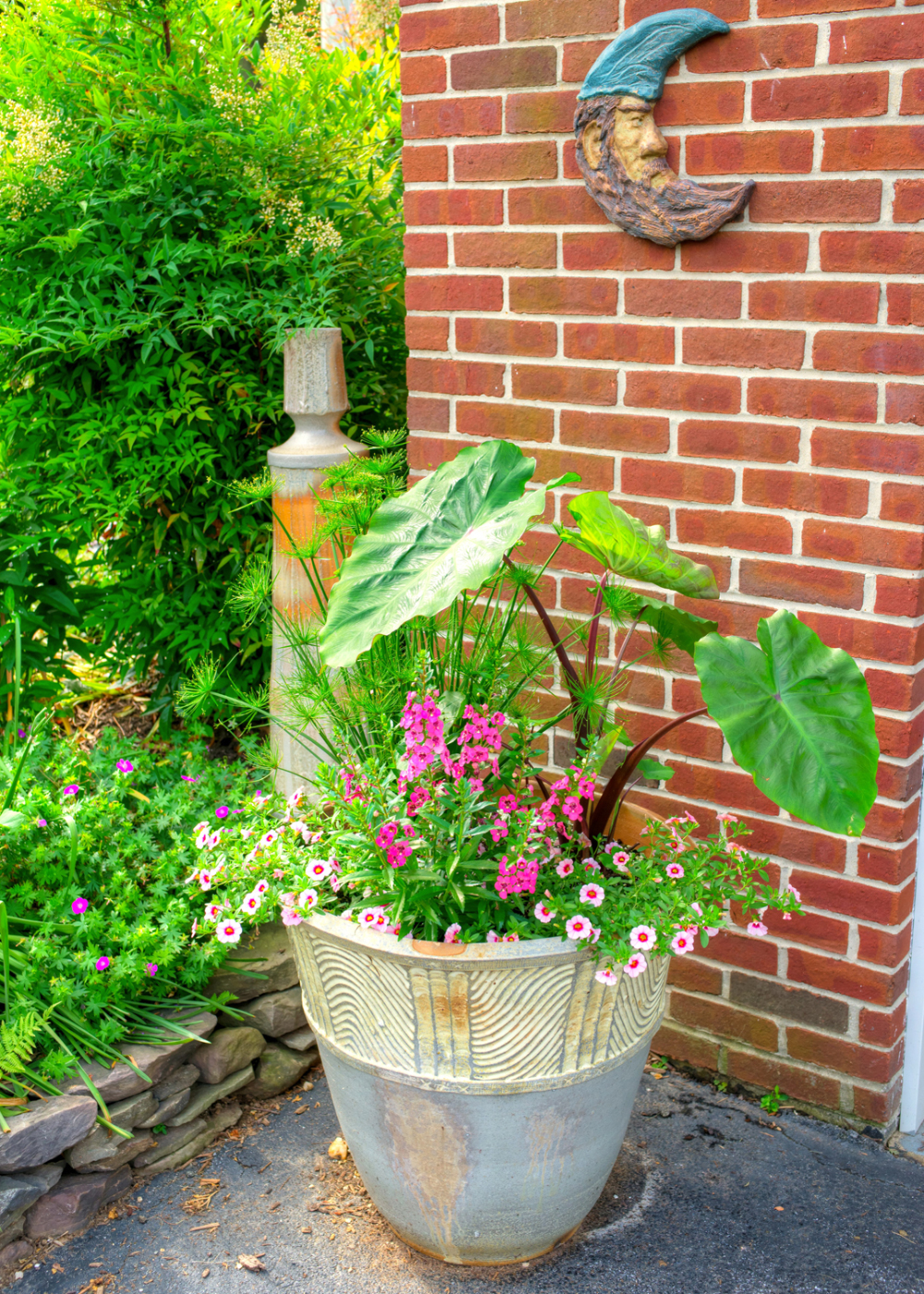 As for the floral display, Stacy employs a combination of annuals and perennials to ensure colorful blooms from spring through late fall. “I’ve gravitated to a palette of opposite colors,” she says. The landscape is also filled with several varieties of hydrangea, as well as native shrubs. Containers are filled with a combination of annuals, perennials and tropicals. While she mulches every year, Stacy does not treat the lawn. “It doesn’t have to look perfect,” she says.