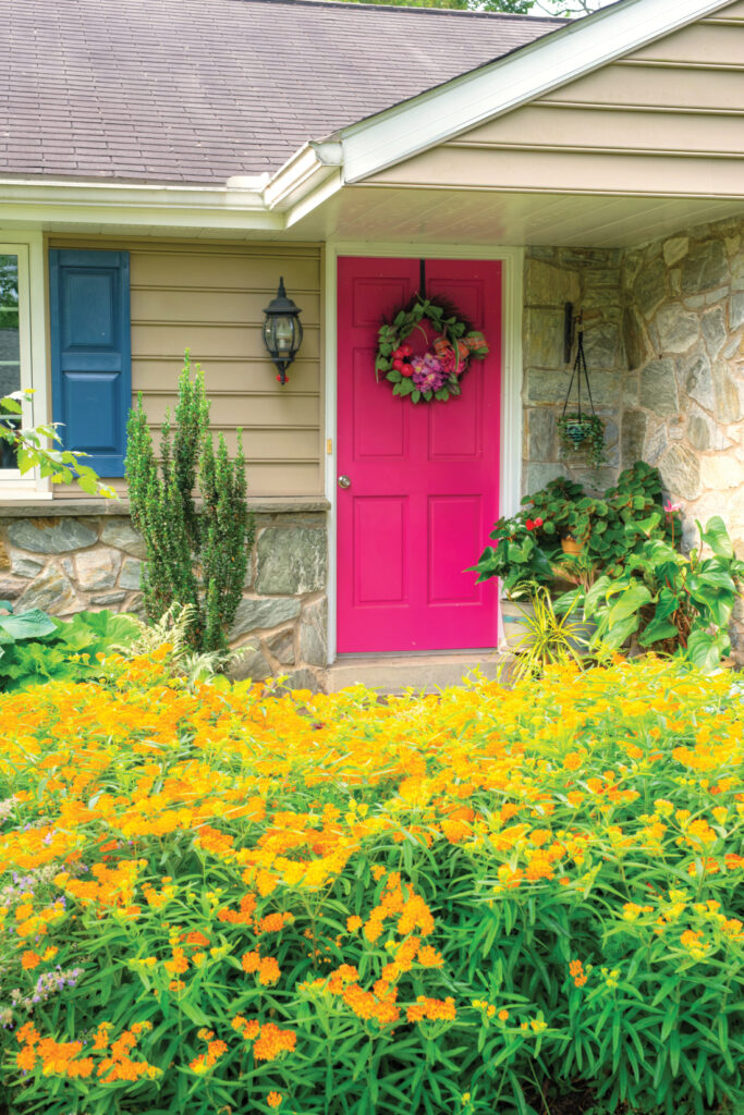 Stacy’s aesthetic has shifted to a fondness for using contrasting colors. Here, the Flamenco Pink door color contrasts with vivid-orange butterfly weed that reaches peak bloom in late June.