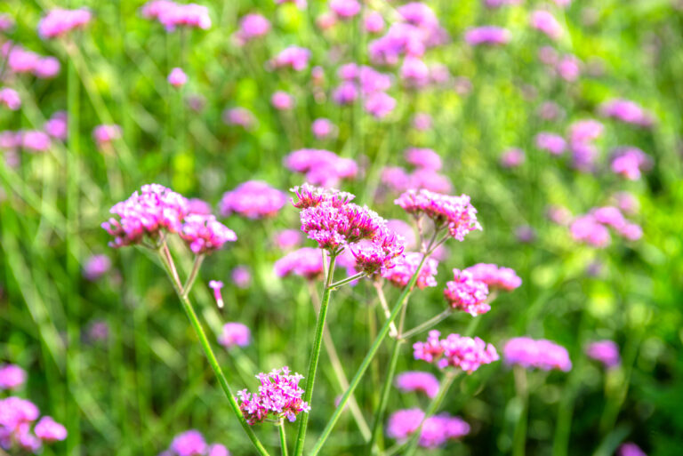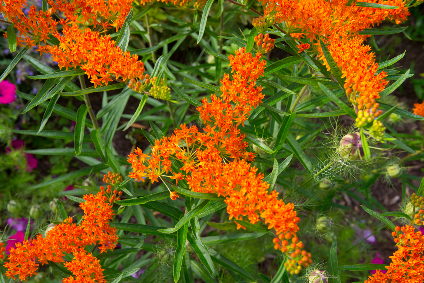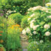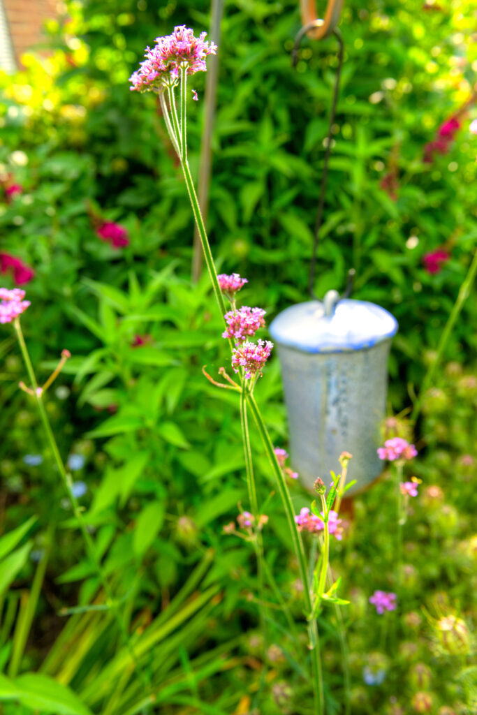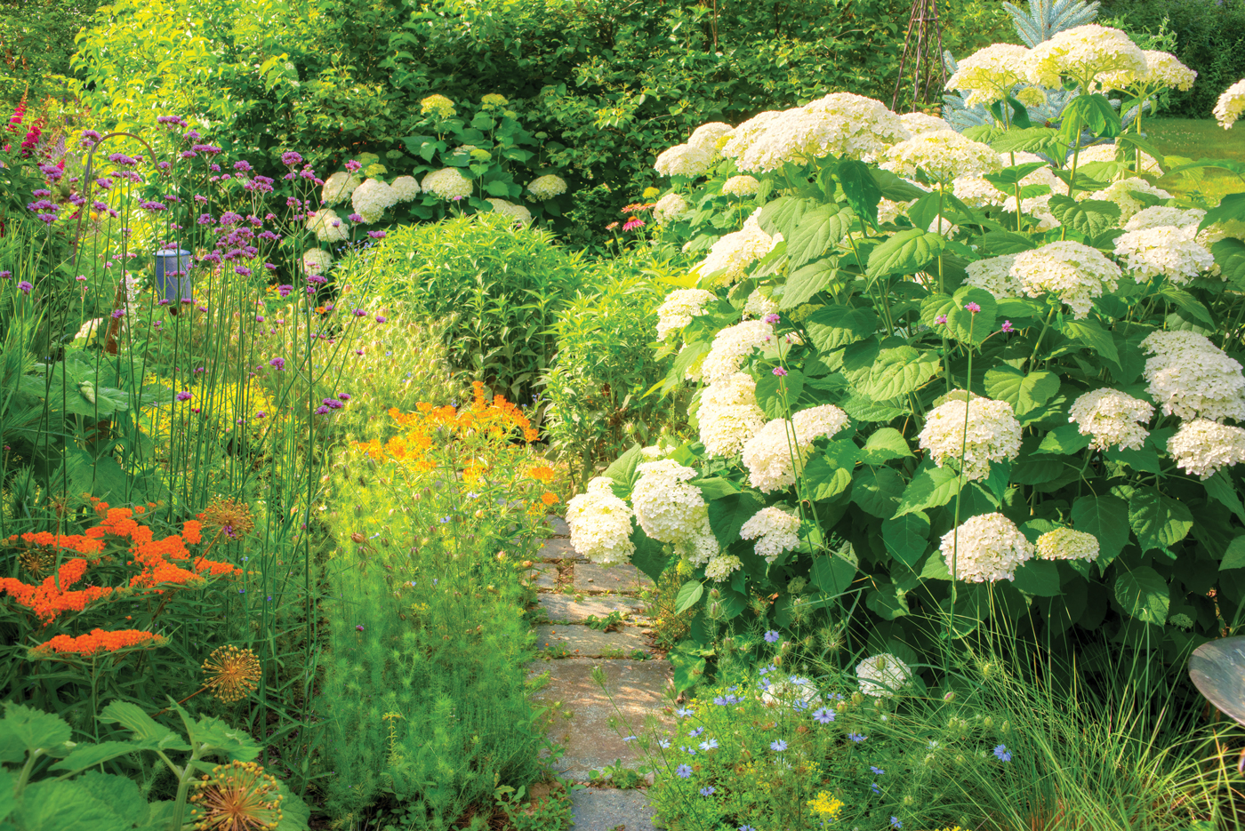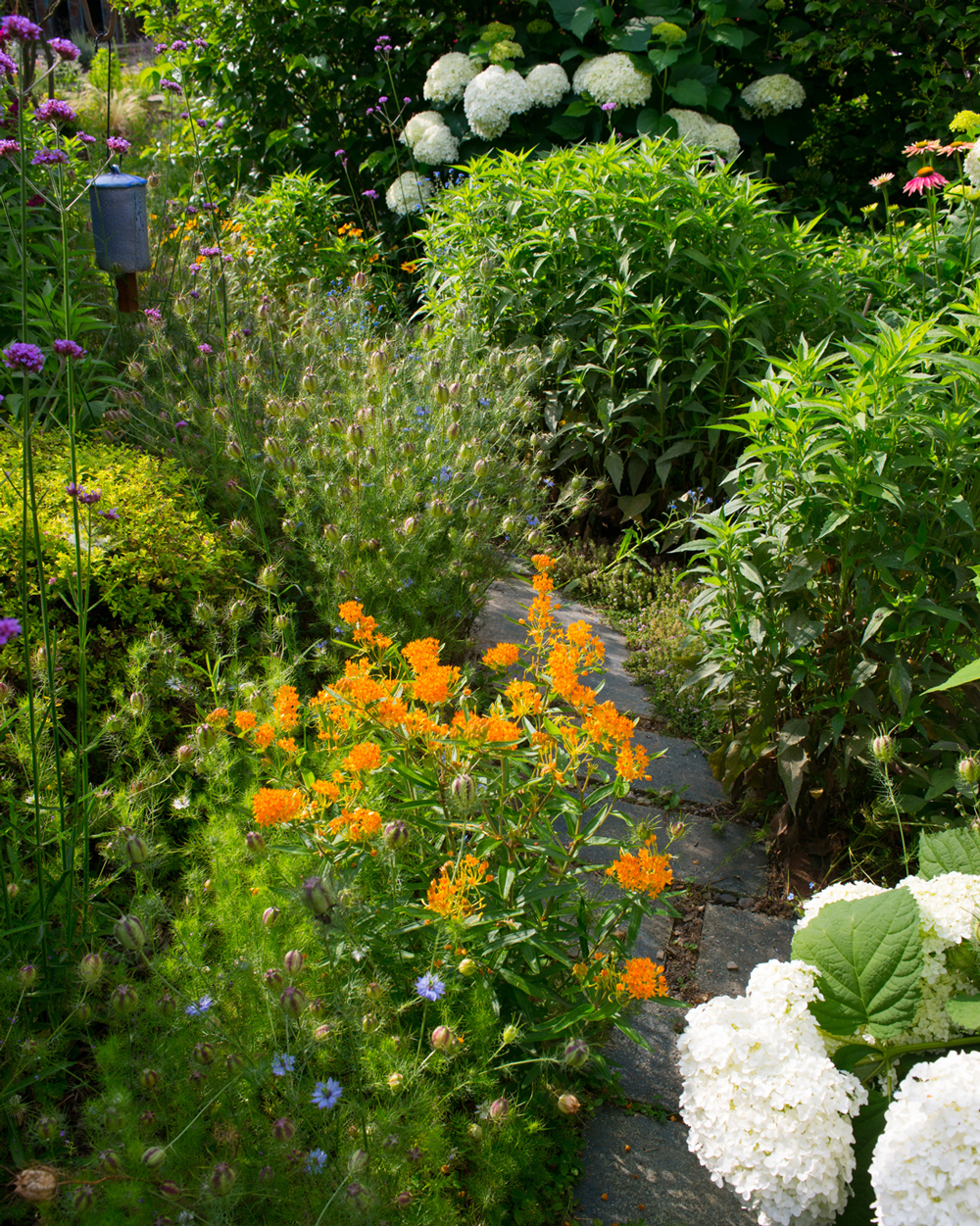 Annabelle hydrangea, verbena bonariensis, butterfly weed, love-in-a-mist and other perennials define this garden.