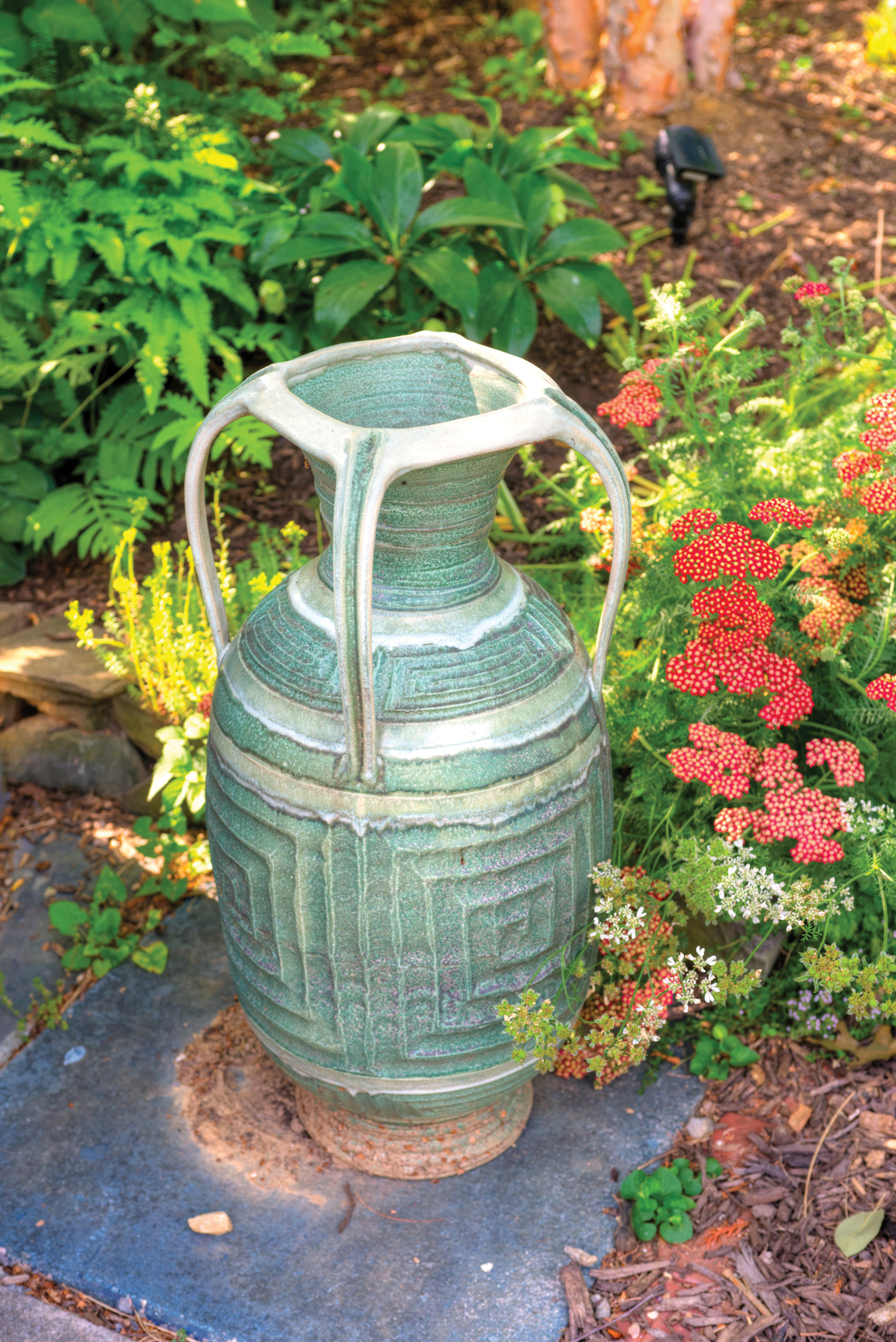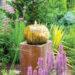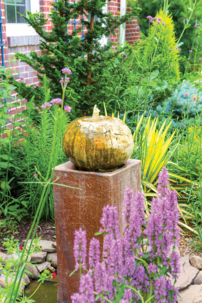 Phil Kreider created the fountain, while Kevin crafted the base for this water feature. It’s surrounded by hummelo (foreground), yucca and verbena bonariensis (tall purple plants), which self-seeds.