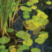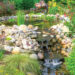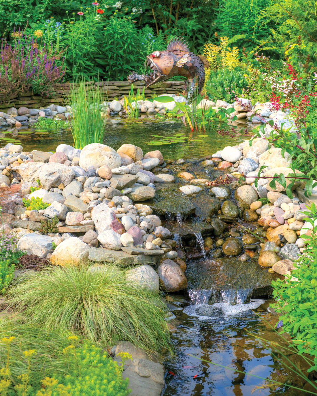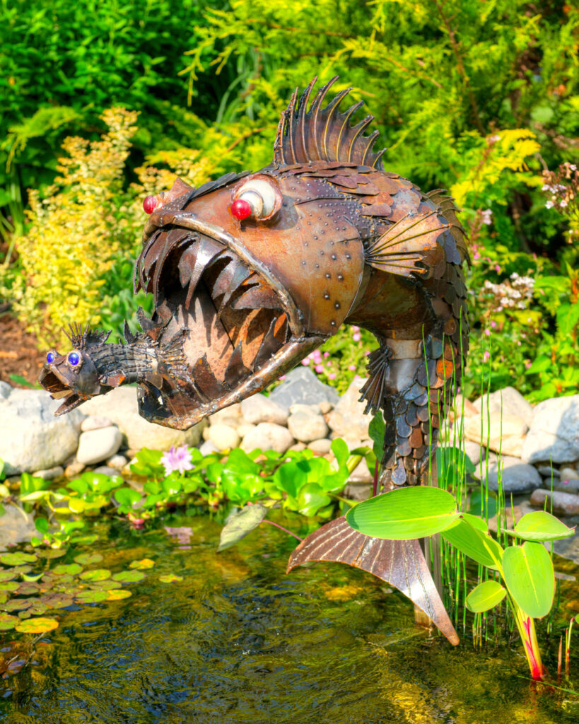 The pond started out small but has grown over the years. The primal-fish sculpture was created by John Morrow.
