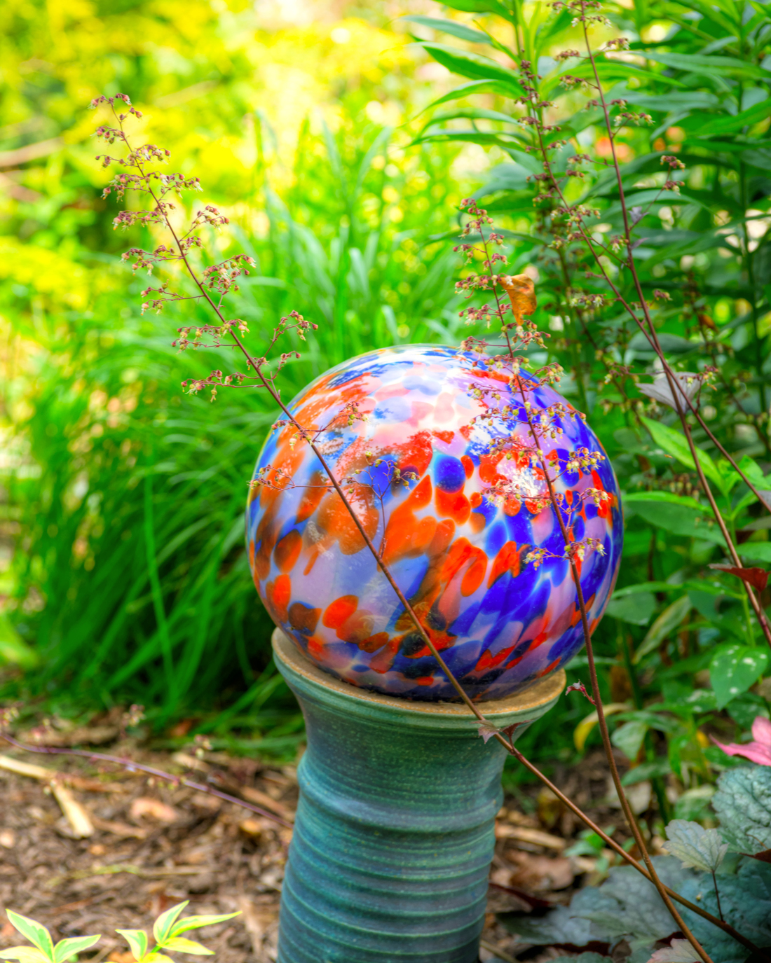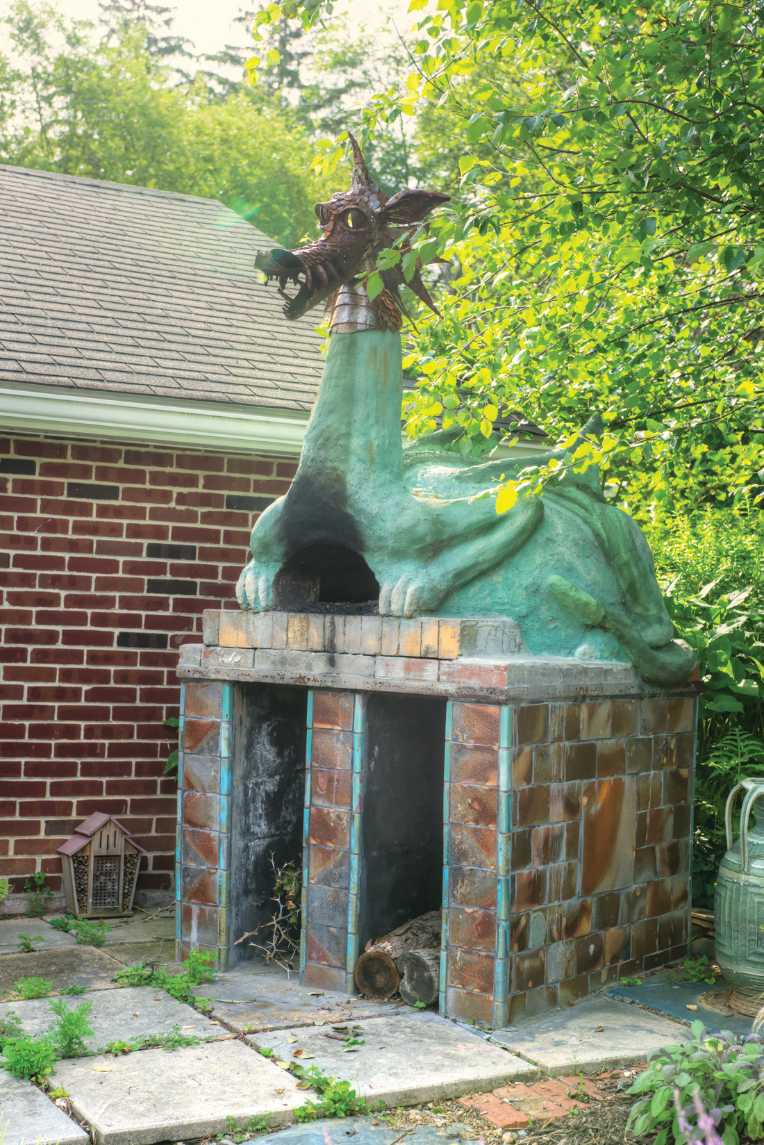 Her methodology doesn’t employ grand measures – Stacy simply uses a garden hose or roping to create the outline of a bed and then, depending on the time of the year, smothers the grass by covering it with newspapers or cardboard. As for the artistic element, Kevin supplies that via his pottery, sculptures and glass creations.