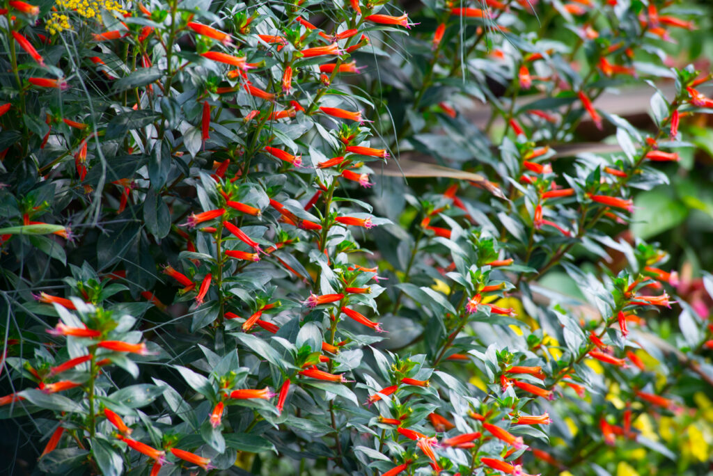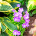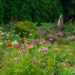 The juxtaposition of the two neon-like colors somehow works. As is often noted, any color or combination of colors seem to look natural in the great outdoors. Another bed filled with a variety of flowers and plants fills a sloped area of the front yard.