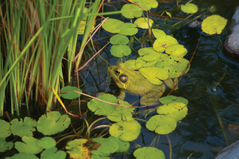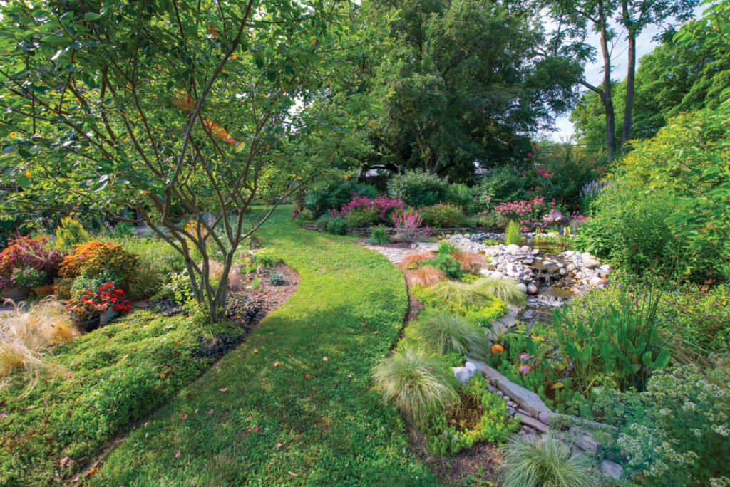 The neighborhood in which Stacy and Kevin live dates to the late ’50s and therefore boasts large lots. Other than a few trees and some overgrown shrubs, an expanse of lawn defined the couple’s yard. “Grass was pretty much it,” Stacy says of the landscaping. So, she went to work, creating meandering pathways, islands, gardens, water features, sitting areas and a composting area in an effort to transform the lot into a natural habitat.