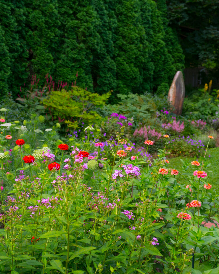 One thing that immediately stands out at Stacy and Kevin’s home is the fact that the garden is a kaleidoscope of color. The pop of color begins at the front door, which is painted a color called Flamenco Pink. “I had to work with the color tones in the stone and siding,” she explains. “I always bounce ideas off my mom, who is good with color – I can always count on her to reign me in!” Then, another shock of color – orange – materialized when Stacy added a few butterfly-weed plants along the walkway. In the fall, she harvested the seed-filled pods and scattered them in the bed she had enlarged.