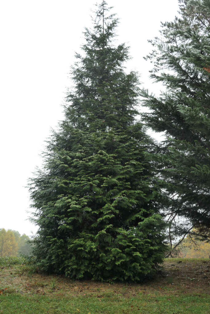 Thuga ‘Green Giant’ is a vigorous, fast-growing arborvitae hybrid (grows 3 to 5 feet per year) with a regular pyramidal habit and attractive foliage year-round. It is exceptional as a specimen tree or can be pruned into a hedge or screen. It is not subject to damage from snow and ice. It is a far superior to another popular fast-growing conifer, the Leyland cypress.