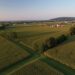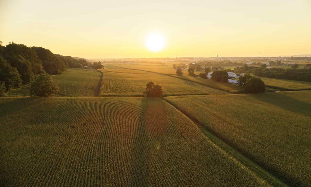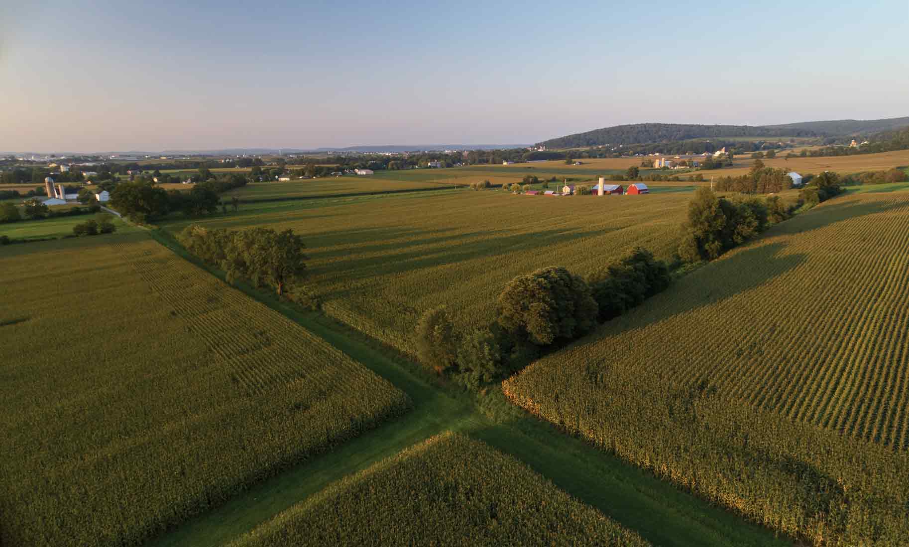 Looking west, the drone shot takes in the treeline of the Welsh Mountains, acres of fertile farm fields and the town of New Holland.
