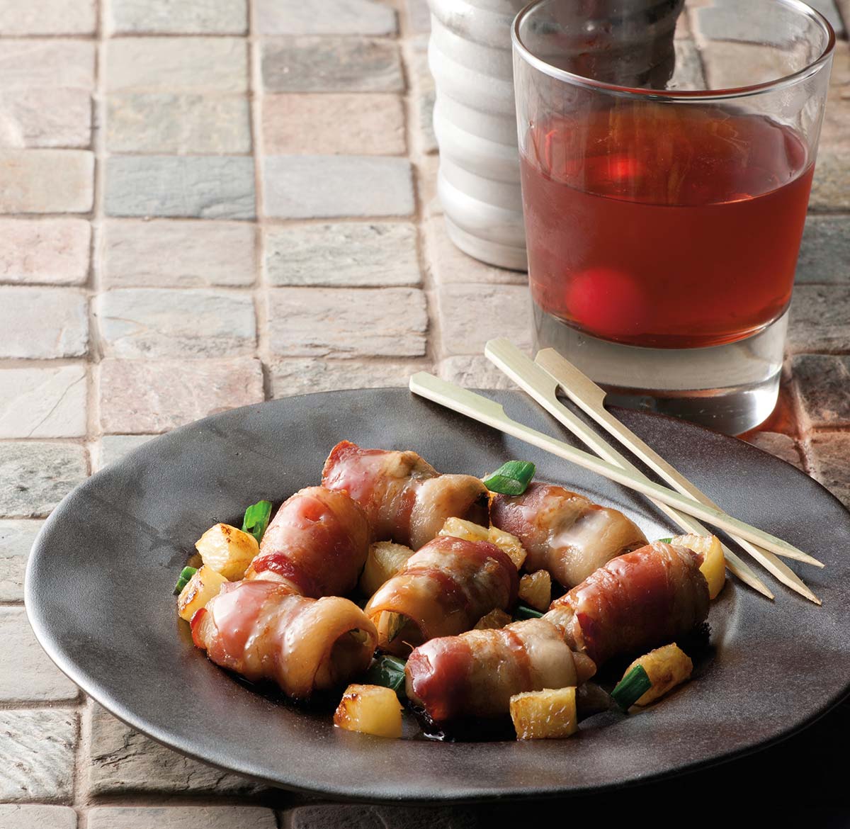 In order for food to share the spotlight with this libation, it needs to be equally as substantial. For some reason, the combination of the rye and the cherry makes me think of Hawaiian pork barbecue. Feeling inspired, I wrapped hardwood-smoked bacon around pieces of chicken thigh and green onion. It then gets baked until crisp. Finally, the bundles are lightly brushed with a roasted-pineapple and soy glaze. There’s something about the way the subtle flavor of the cherry in the drink finishes off the “Polynesian thing” that the food provides.