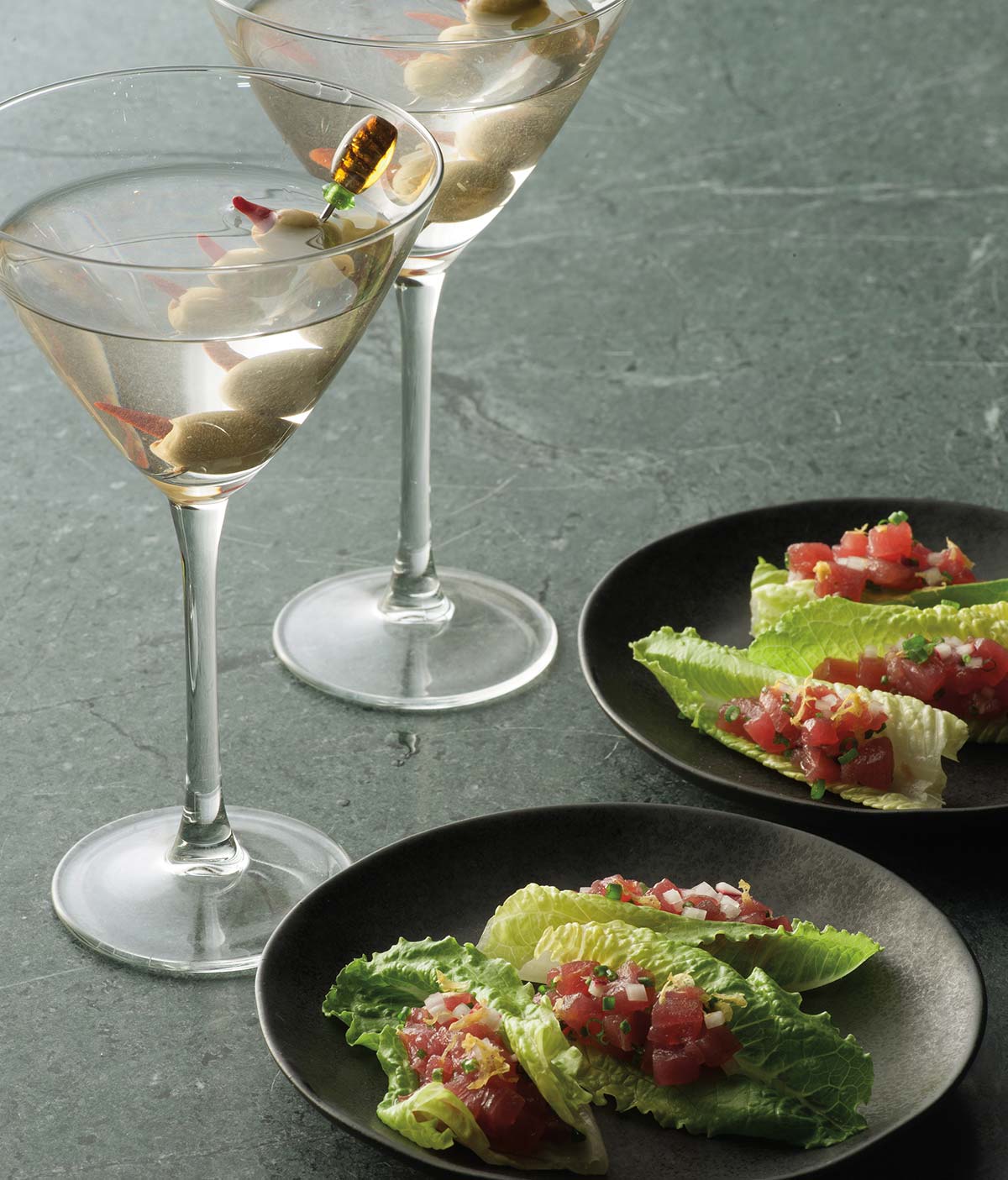 Martinis are about as classic as it gets. Of course, nowadays Martinis are made with just about anything, but the classic gin and dry vermouth combination, garnished with a few olives, is the original. The taste sensation is citrusy, herbaceous and briny and just begs for something like chilled salmon, oysters or tuna. I chose the latter: Raw, sushi-grade tuna, which is finely diced “tar tar-style” and dressed with a little olive oil, lemon, radish and chives and served in heart-of-romaine leaves, is just the ticket. A “dirty” Martini, where some of the olive brine is added along with the olives, would introduce a Mediterranean flavor. And by using chili pepper vs. pimento-stuffed olives, you would be set for that cold winter night!
