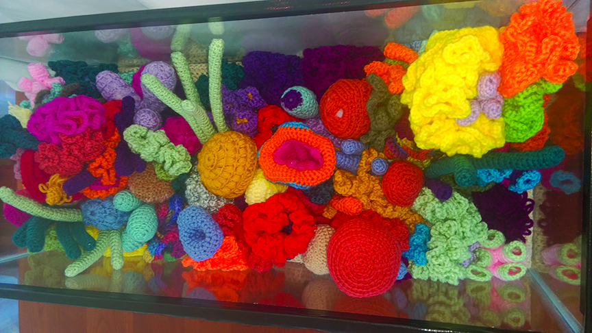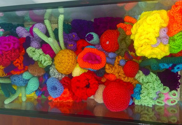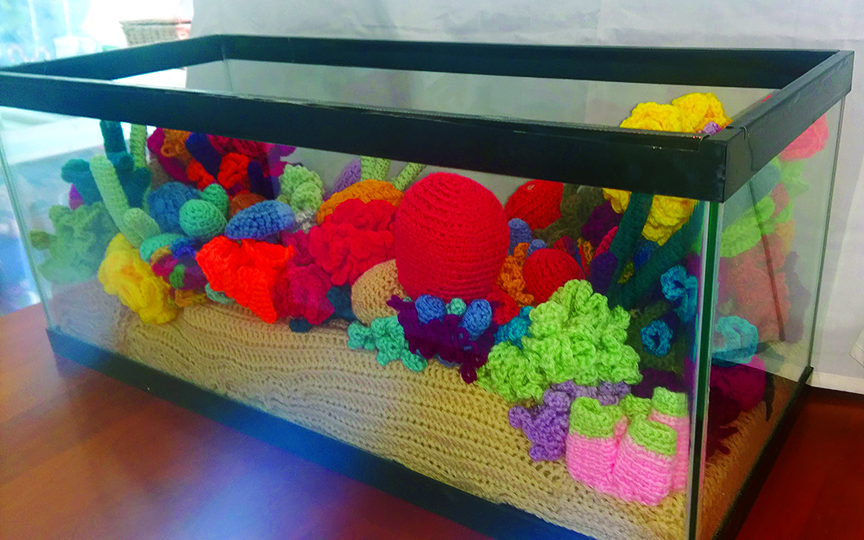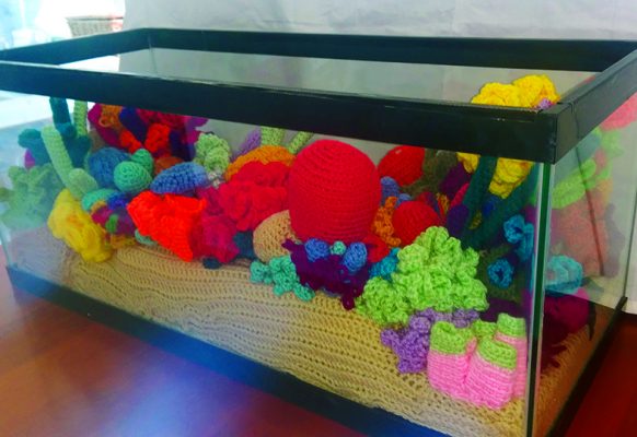 Note from the artist: I started this a few years ago and finished it the first week I was off work because of the pandemic. I’ve seen rooms filled with crocheted coral reefs – this is my downsized aquarium version!