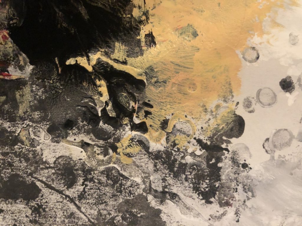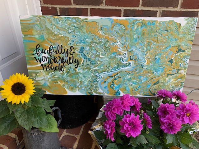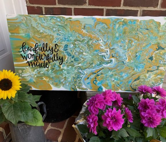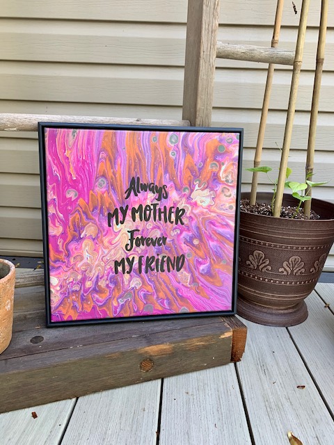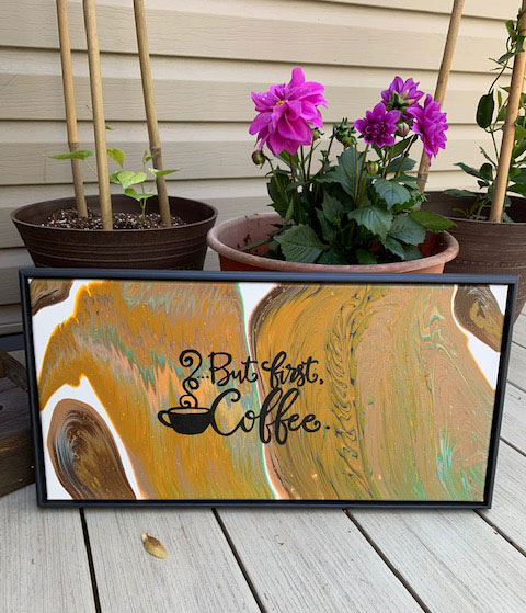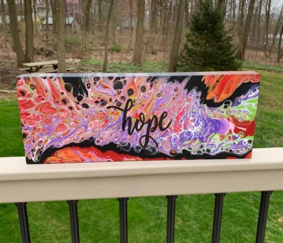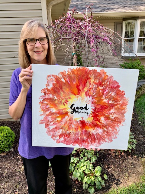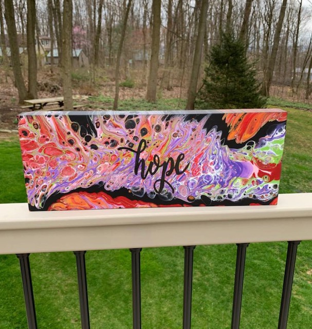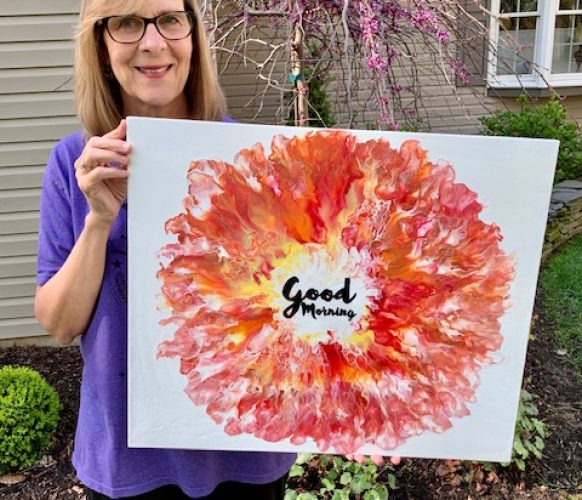 Note from the artist: This art is Acrylic Pouring Art. With this technique the paint is diluted and then poured onto a canvas and altered by inclining the surface to make the paint flow. This form of art does not attempt to represent reality, but it seeks to achieve its effect using shapes, forms and colors. No two are ever alike and it’s always fun to see how the paint will flow.