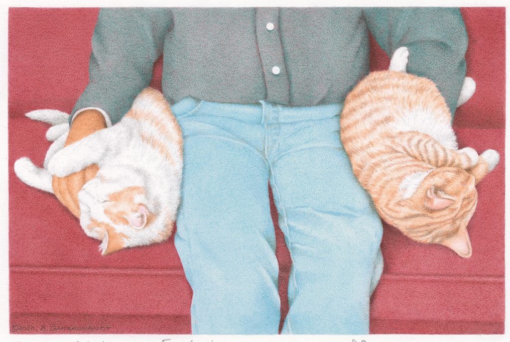 Note from the artist: “Social Distancing Exclusions” is my latest colored pencil drawing, featuring my friends Jack and Buddy – who refuse to abide by the six-foot distancing guidelines.