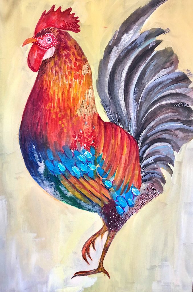 ¨Ringo the Rooster¨ – acrylic, gouache, watercolor, white gel pen, chalk pastel