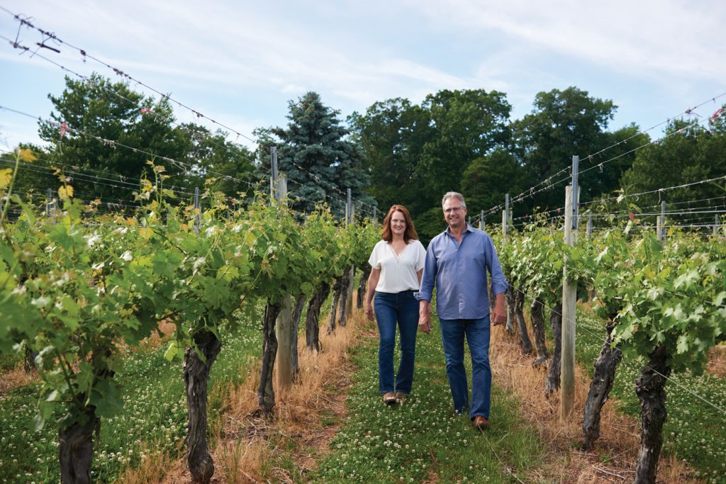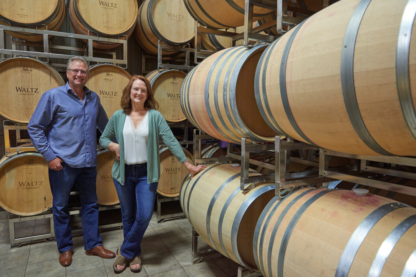 Kim and Jan Waltz walk through the vineyards of their farm. Waltz Vineyards began in the Waltzes’ garage in 2000 and today includes a state-of-the-art winery, three tasting rooms/shops and 35 acres of grapevines.