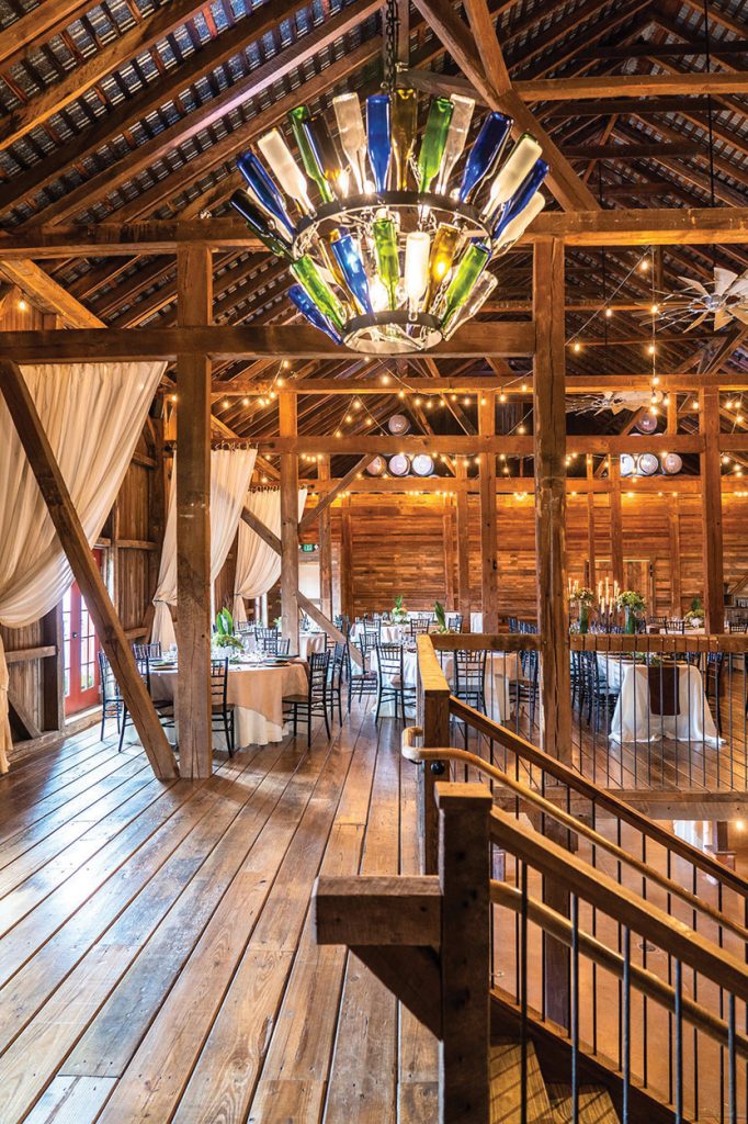 A restored barn at Mount Hope Winery that is used for special events features a creative chandelier made from wine bottles. Nick Gould Photography.