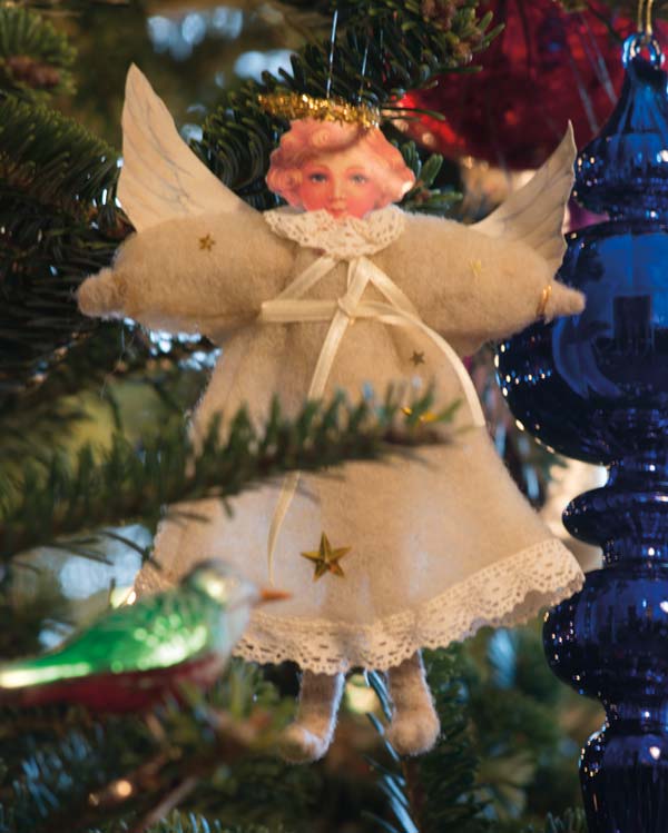 Dawn decorated this feather tree with ornaments shaped like grape clusters, greeting and trade cards that were transformed into decorations with the addition of fringe and the requisite angel tree topper, which was typically made from  tinsel and porcelain or wax. The angel toppers represented childlike innocence and purity.