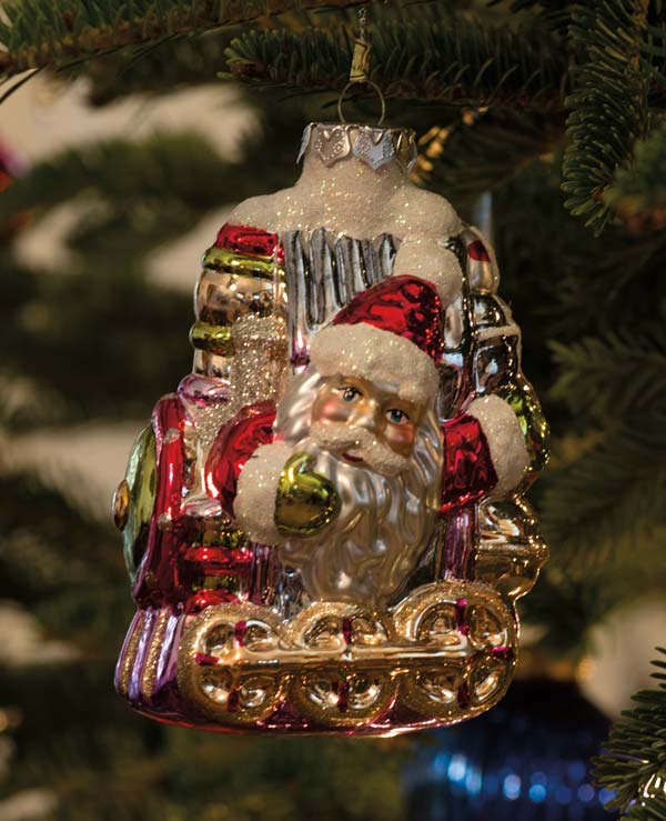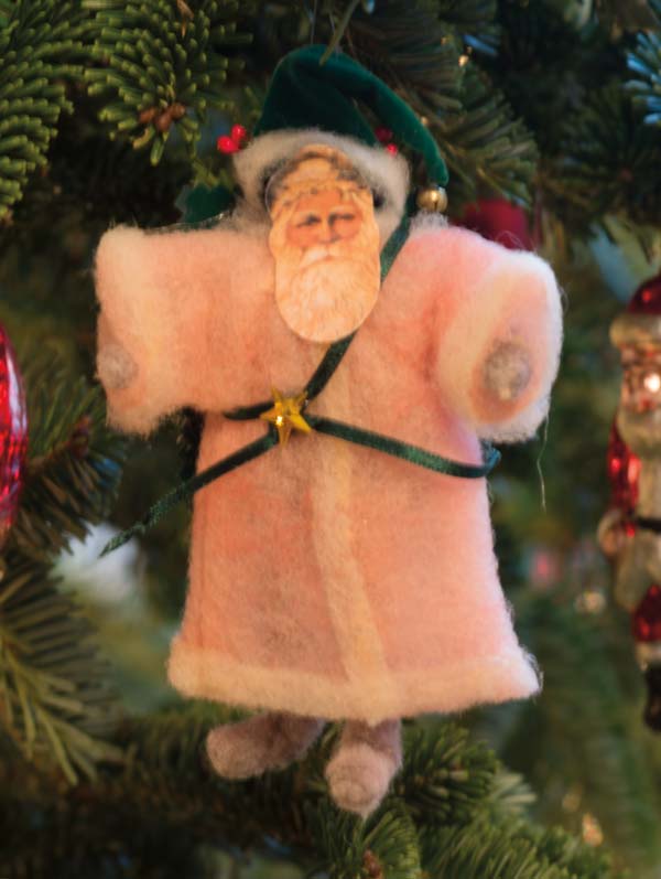 Dawn also arrived with what Jeanne estimated to be “a million boxes of ornaments.” Inside the boxes was a treasure trove of Victorian-style ornaments that ranged from reproductions of the distinctive styles of Germany to replicas of the “handmade” designs that would have been crafted from scraps of fabric or spun cotton/wool. “I used everything I have, plus I borrowed things from the National Christmas Center,” Dawn notes. The reproduction ornaments came from companies such as Old World Christmas and Christopher Radko. The ornaments took the shapes of angels, birds, balloons, trains and Santa. The Victorian custom of placing treats, such as candy, nuts and fruit in baskets (often created from blown eggs) and small gift bags, and hanging them on the tree was also represented. Antique prisms and Moravian-like stars also brought some sparkle to the tree. Wax candles and icicles also decorated the tree.