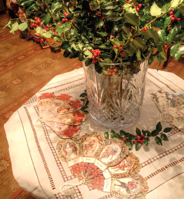 The Victorians decorated their homes with holly and other greenery at holiday time. They believed that holly brings good fortune. A holly tree in the garden was thought to protect a house from fire. Mistletoe was originally viewed by the Greeks and Romans as a holy plant in that it had the power to drive away evil and bring enemies together by embracing beneath it. The Victorians introduced the kissing concept to the superstition. In some cultures, kissing under the mistletoe ensures good luck. In others, it is believed that if a woman refuses the kiss, bad luck will follow. Note the reproduction fans.