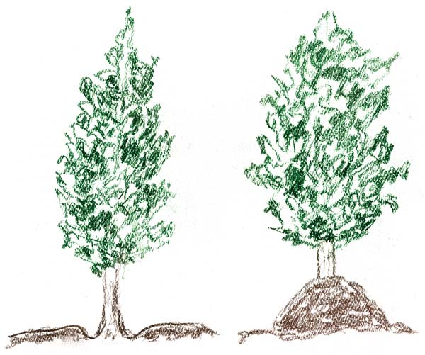 Related to this: When you’re planting containerized trees (just home from the nursery), be sure to scratch around the top layer of soil or growing medium and expose the flare of the trunk, making sure it remains above ground level. Often, nursery-grown trees are transplanted from container to container as they grow during production, and the tree base ends up deeper in the soil than appropriate.