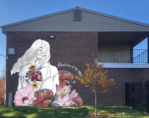 The theme of the mural is “Revolution of the Heart” and depicts a woman’s heart transforming from stone into a bouquet of colorful flowers. PPG Paints donated the paint and supplies.
