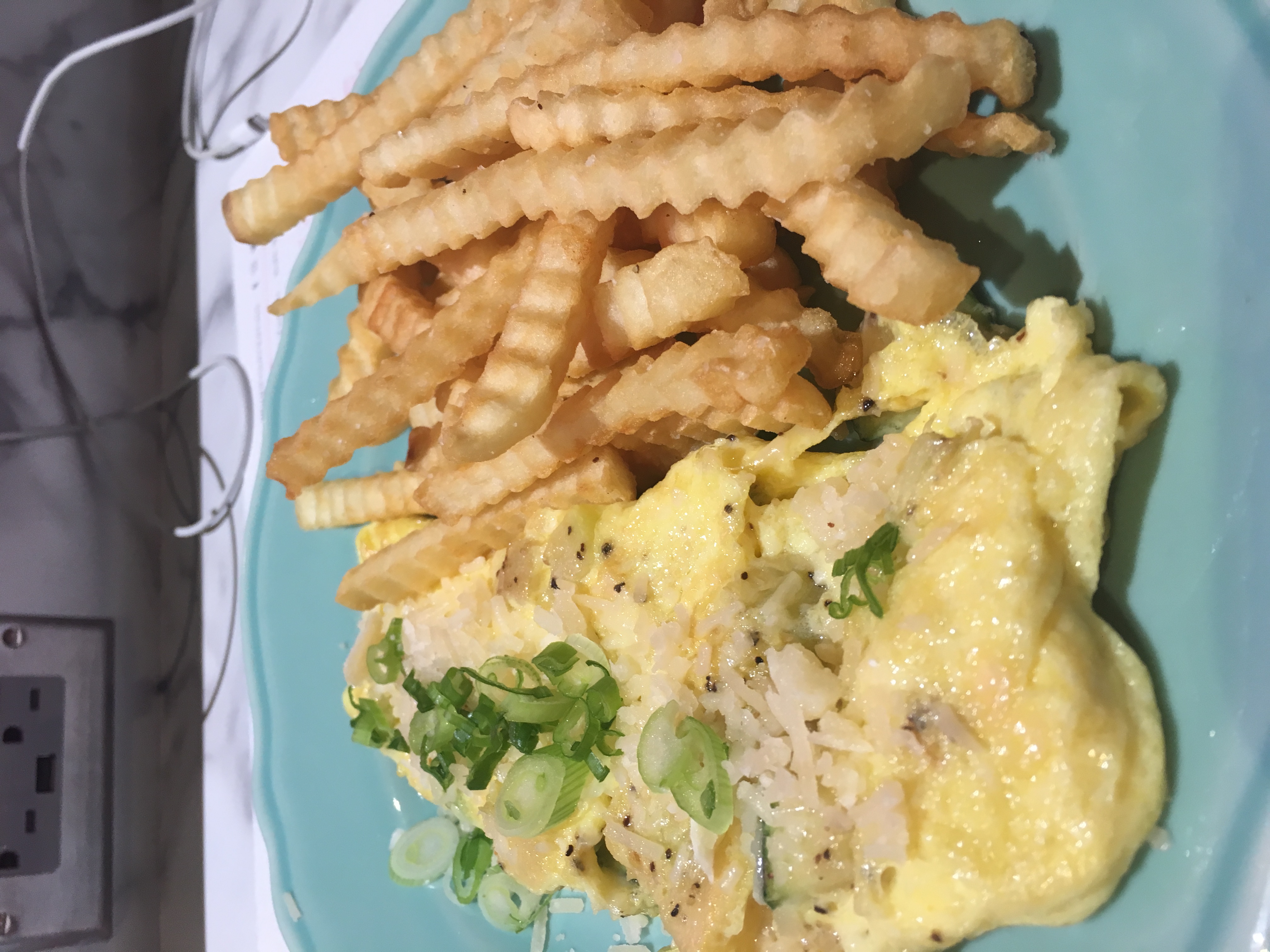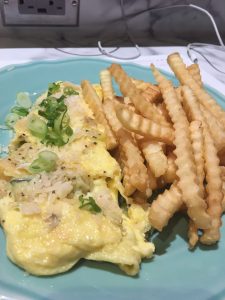 I also had a regular black and white milkshake (half chocolate, half vanilla ice cream) and tried a “Summer Zucchini and Parm Omelette,” two eggs with shaved parmesan, local zucchini, and a choice of tots, crinkle cut fries, or onion rings. It was all delicious, and my only regret was not ordering more onion rings as a side in addition to the order I got from the “Sharables” section of the menu.