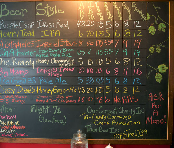 The name Moo-Duck comes from Mike’s bird-watching team. He needed a name for competing in the World Series of Birding while working at the Pocono Environmental Education Center. He says the name is fun, and brewing should be, too. As a brewer, he likes to experiment with more traditional recipes. The brewery’s flagship brews are Hoppy Toad IPA, which has a heavy hop aroma backed by a solid malt background; Purple Carp Irish Red is seriously malty and carries a little roasted flavor; Mistopheles is a big Imperial Stout with the usual notes of chocolate and coffee; The Remedy is a light and refreshing honey chamomile wheat beer made with Orange Blossom honey; The Great 38 is a pale ale brewed with Mosaic Hops (the availability of this beer depends on the availability of this particular variety of hops).