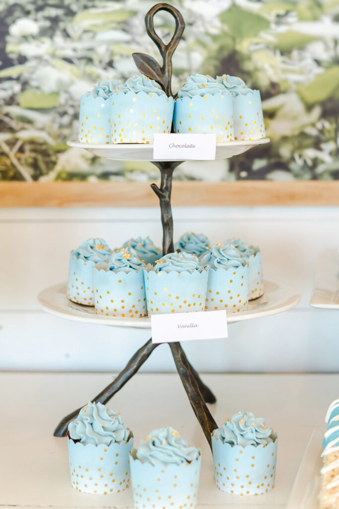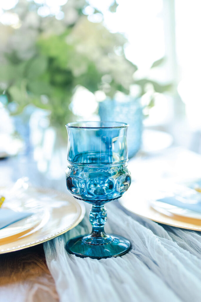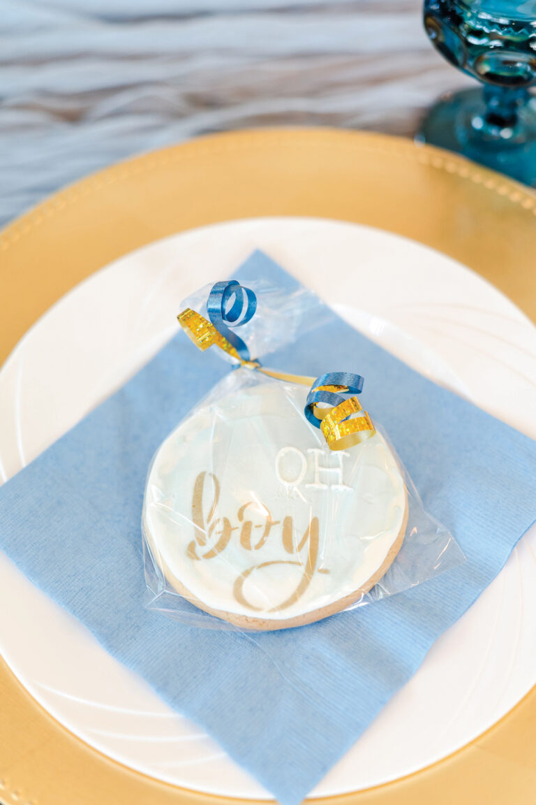 As Kelsey and her husband, Zach, would be welcoming a son, the color scheme had to include blue. For this element, she turned to Caroline’s Rentals, which supplied the vintage-inspired goblets, as well as complementary gold candlesticks and chargers. Paper products and linens added yet another touch of blue to the décor. The detail-oriented Kelsey even made sure to wear a blue dress for the occasion!