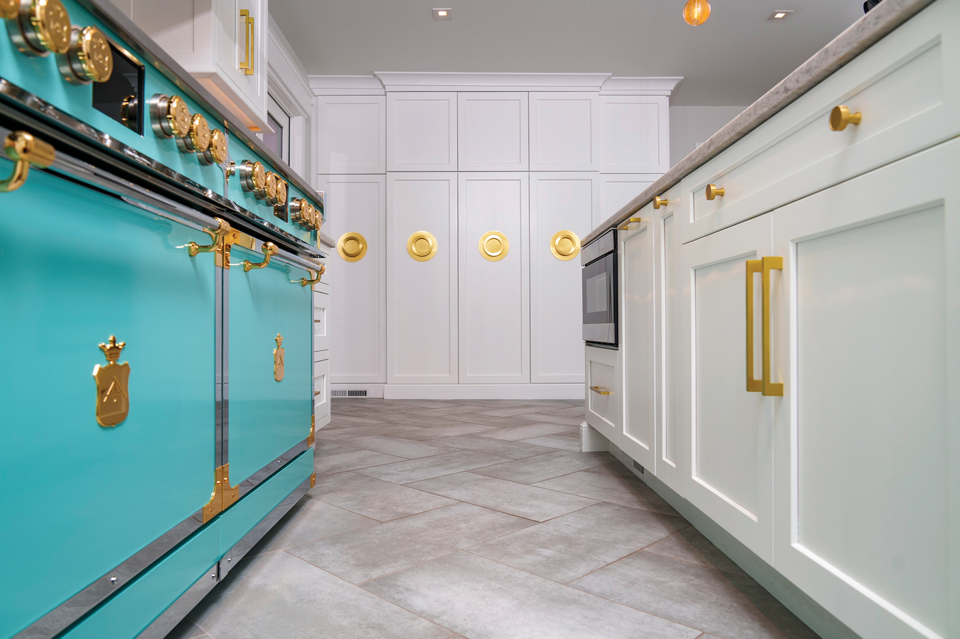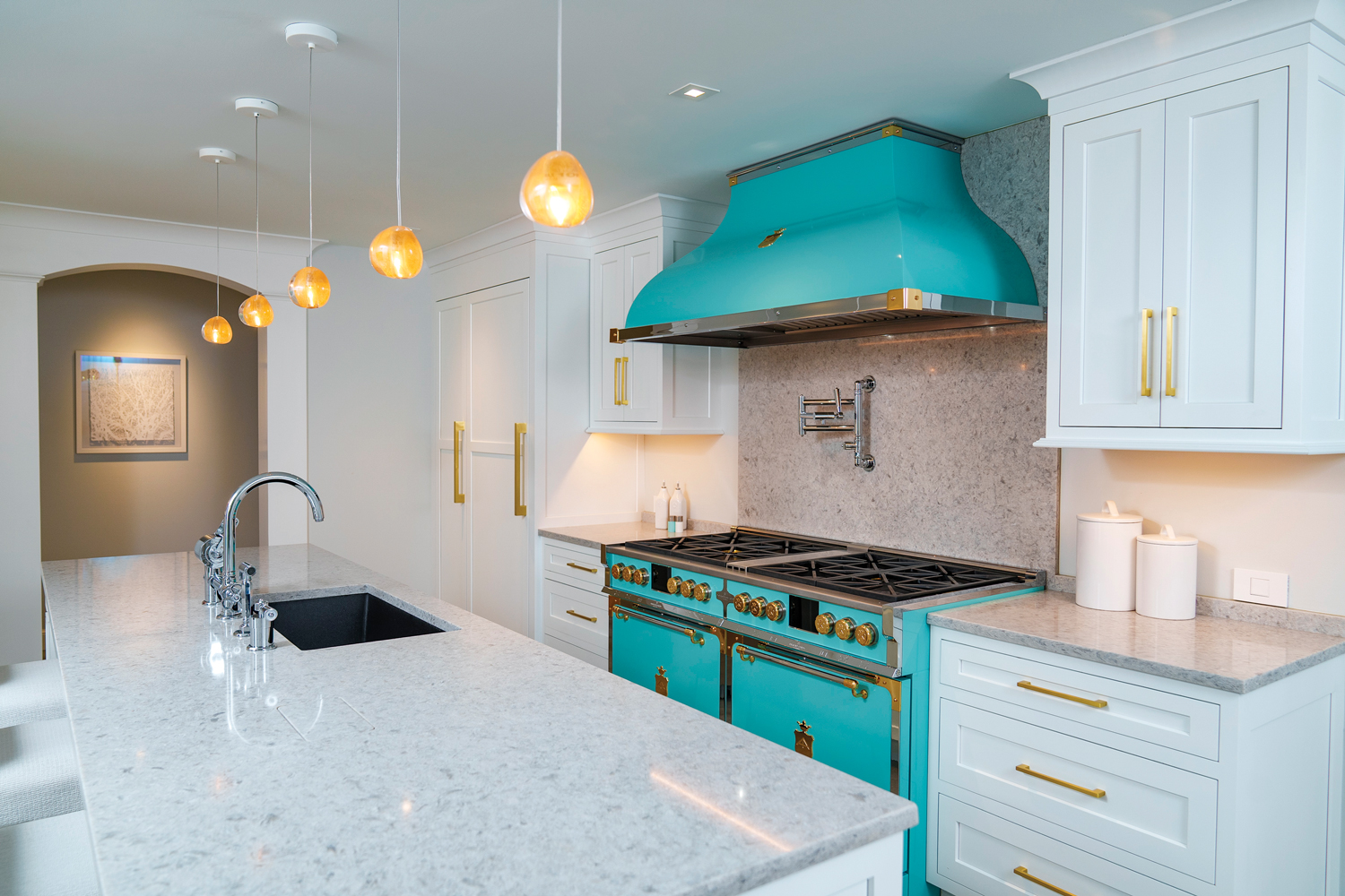 What had been a very outdated and dark kitchen is now one that is light, bright and airy. “It’s not only gorgeous but it’s functional,” Henrietta Heisler says of the redesigned space whose centerpiece is an Officine Gullo range and hood that add a pop of color to the space.