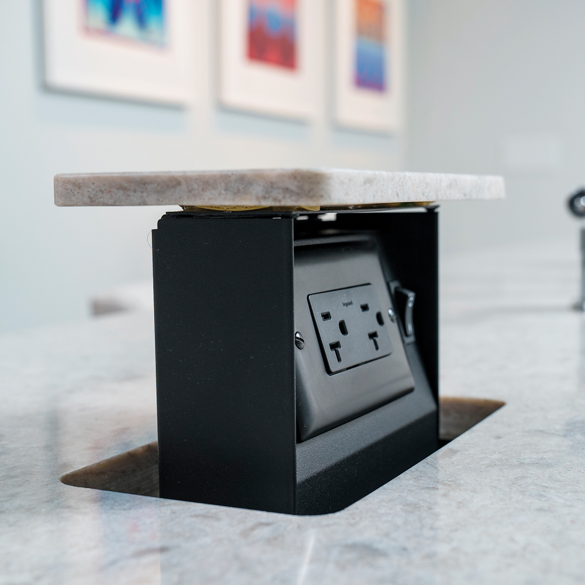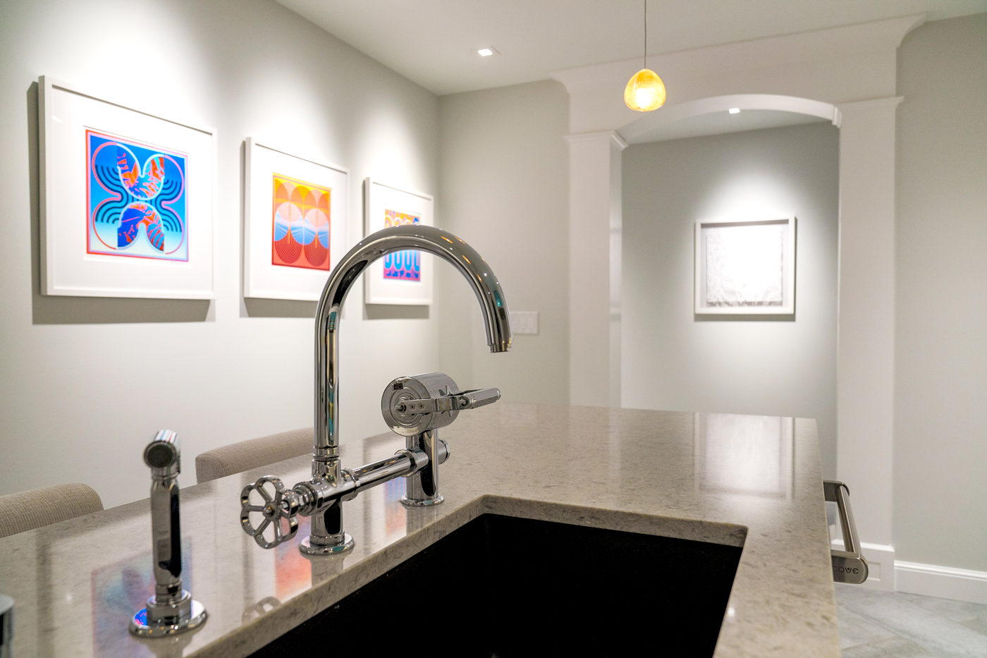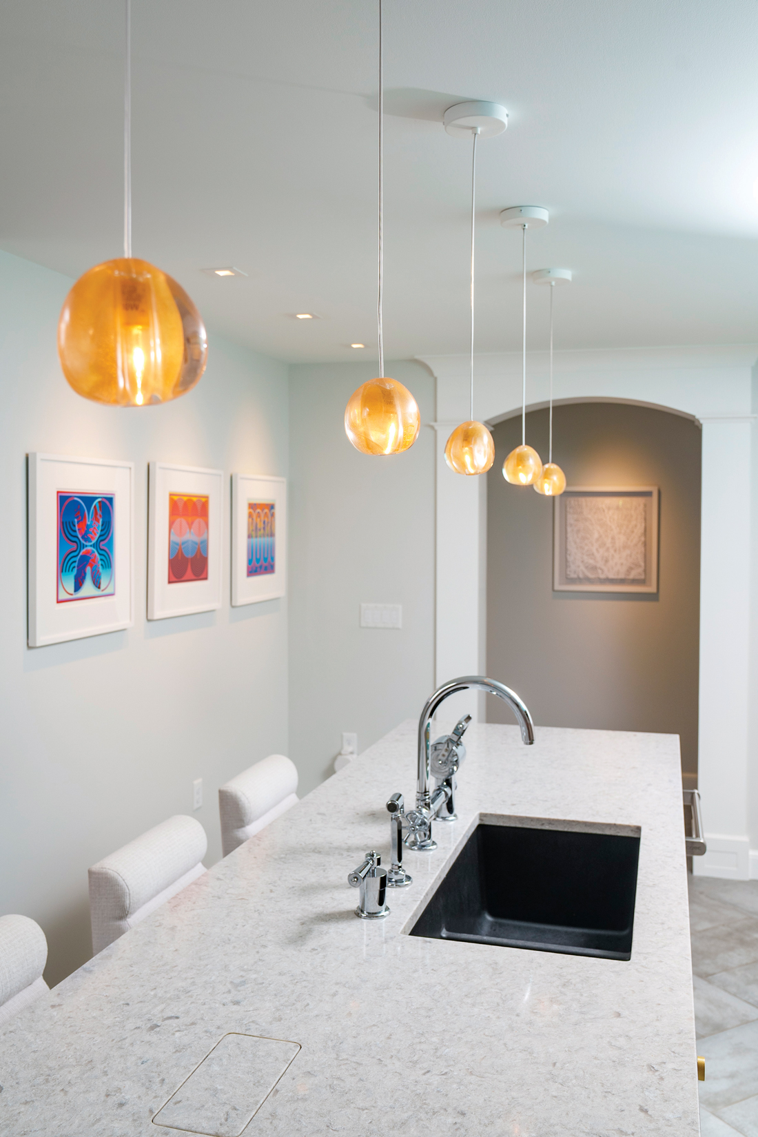 Quartz covers the island and counters. The pendant lighting fixtures were sourced from Italy. The faucet is from Officine Gullo. The pop-up electrical outlet in the island was a surprise for Damon, who loves to cook.