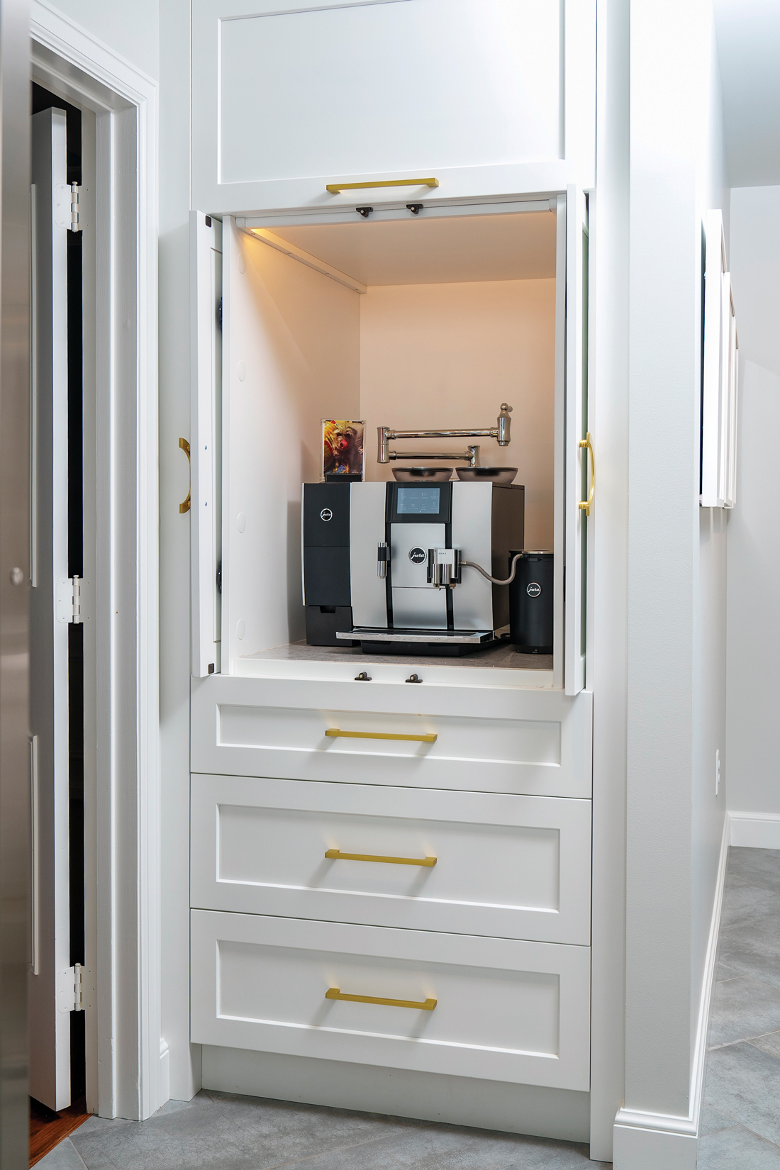 The coffee station, which is outfitted with a Jura coffee maker, is conveniently located in a custom cabinet that is easily accessible from the kitchen island and the formal dining room. Drawers hold necessities for preparing coffee and other hot drinks. “Coffee stations need to be part of the design,” Henrietta says of including elements such as electrical outlets and lighting. In this case, the location is not only convenient but also aesthetically pleasing as retractable doors can be closed to create a seamless appearance.