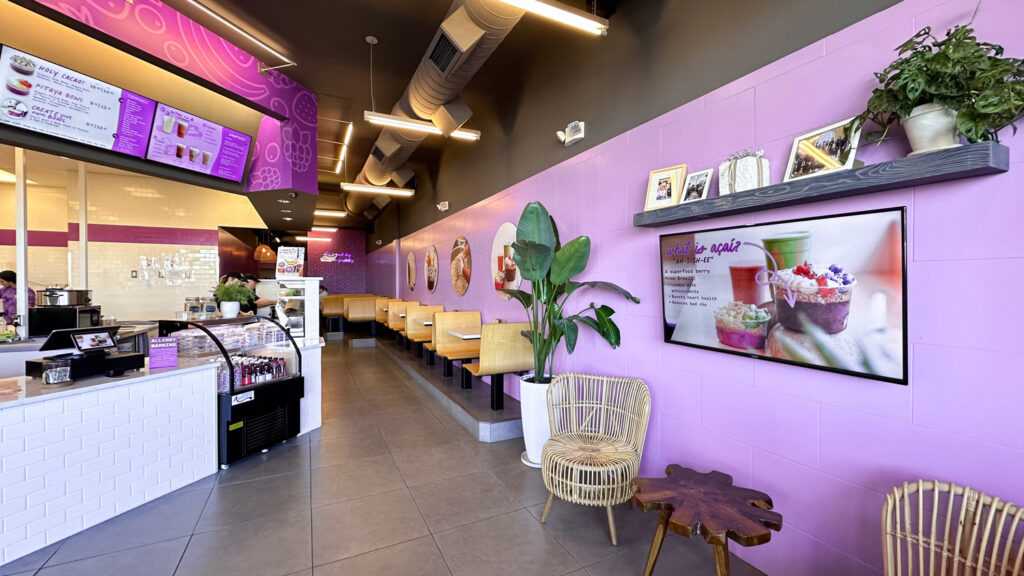The décor of Oola Bowls locations takes its inspiration from the color of the açaí berry. Seen is the new York location. What began as a food truck has expanded to a dozen locations.