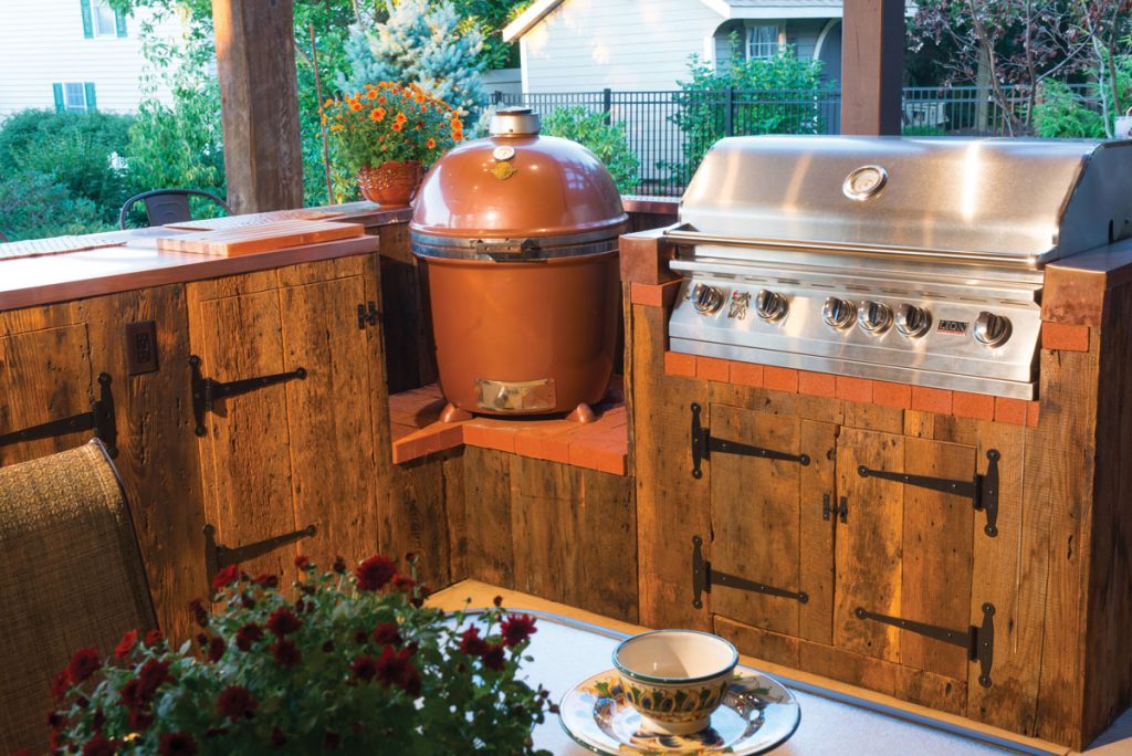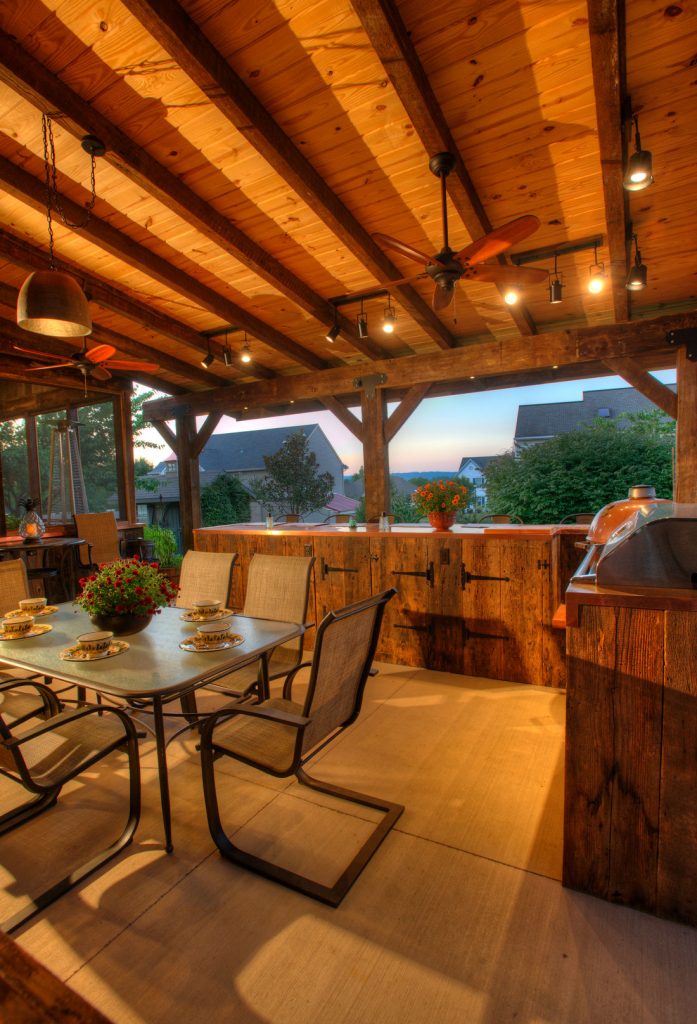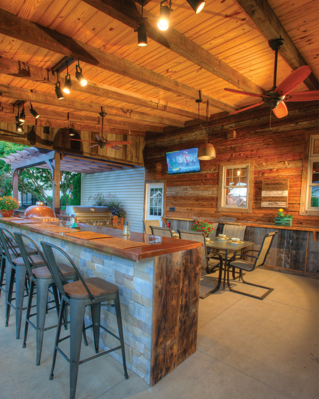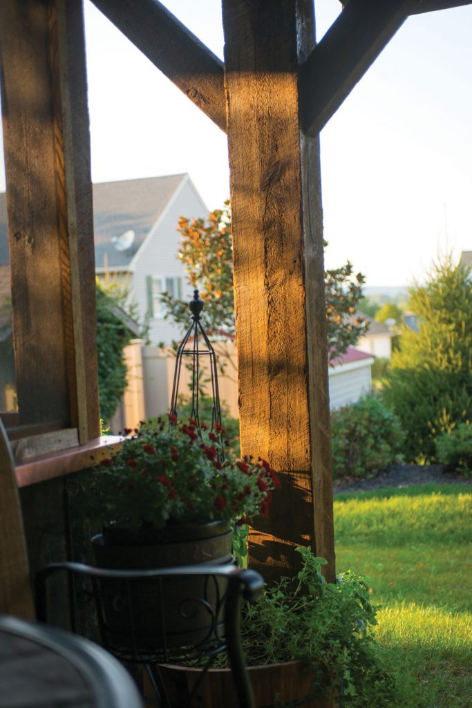 Dwight Graybill of Cocalico Builders was one of the people they interviewed. His interest was piqued at the mention of “different.” He assured them, “I can do different; that’s right up my alley.” To back up his promise, he invited them to take a look at his own outdoor kitchen that entails lots of stone and reclaimed wood, as well as the unique spaces he created at Foxchase Golf Club. They liked what they saw and hired him to transform their backyard. “Nobody had the vision he did,” says Darlene.