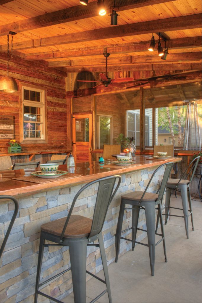 Jeff and Darlene had two must-haves on their wish list: a screened porch for her and an outdoor kitchen for him. Liking the mushroom wood Dwight is so fond of using for such projects, they encouraged him to outfit their outdoor-living space with as much wood as he desired. “I don’t want to see any siding,” Darlene recalls telling him.