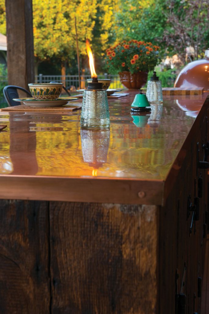 The outdoor kitchen is Jeff’s domain. A fan of grilling and smoking, he can now cook in comfort, plus keep an eye on the television. The original pergola-topped patio was retained.