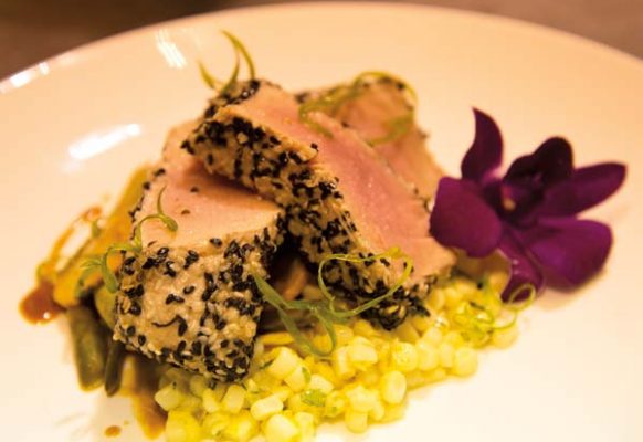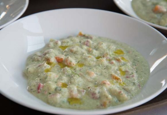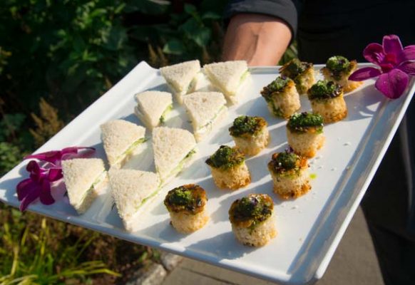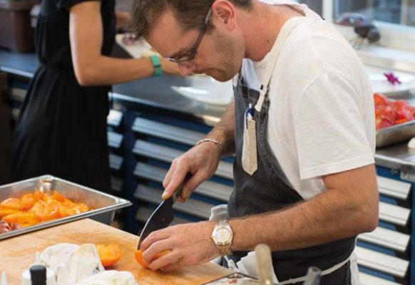 While James and Tim planned to prepare the soup course (cucumber), they turned to Chef Rafe Hottenstein of The Greenfield Restaurant for the balance of the menu that would feature produce from their garden. Rafe, who champions locally grown products in his restaurant, was fully onboard and set to work designing a menu for the 14 members and their guests. On the night of the party, Rafe and his staff set up shop in a portion of one of the warehouses that does double duty as a catering kitchen. “We do a fair amount of entertaining, so it comes in handy,” Tim explains.